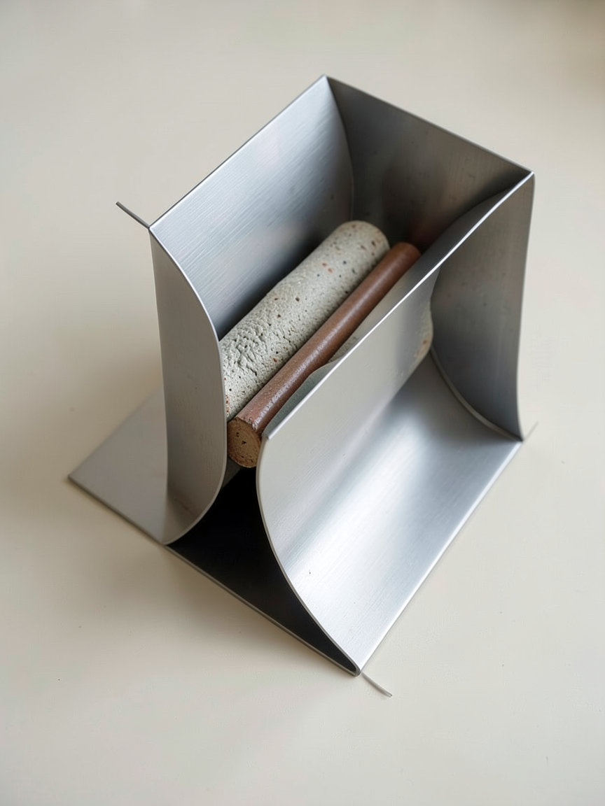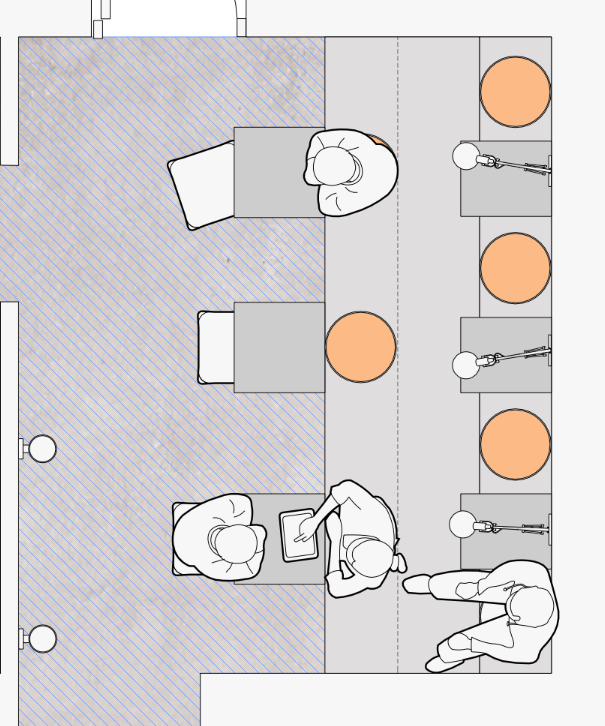 es un espacio de un restaurante con una grada de dos alturas estilo industrial revestidos de cemento con un cojin las mesas de delante son de inox y hay unos taburetes cuadrados de inox tambien