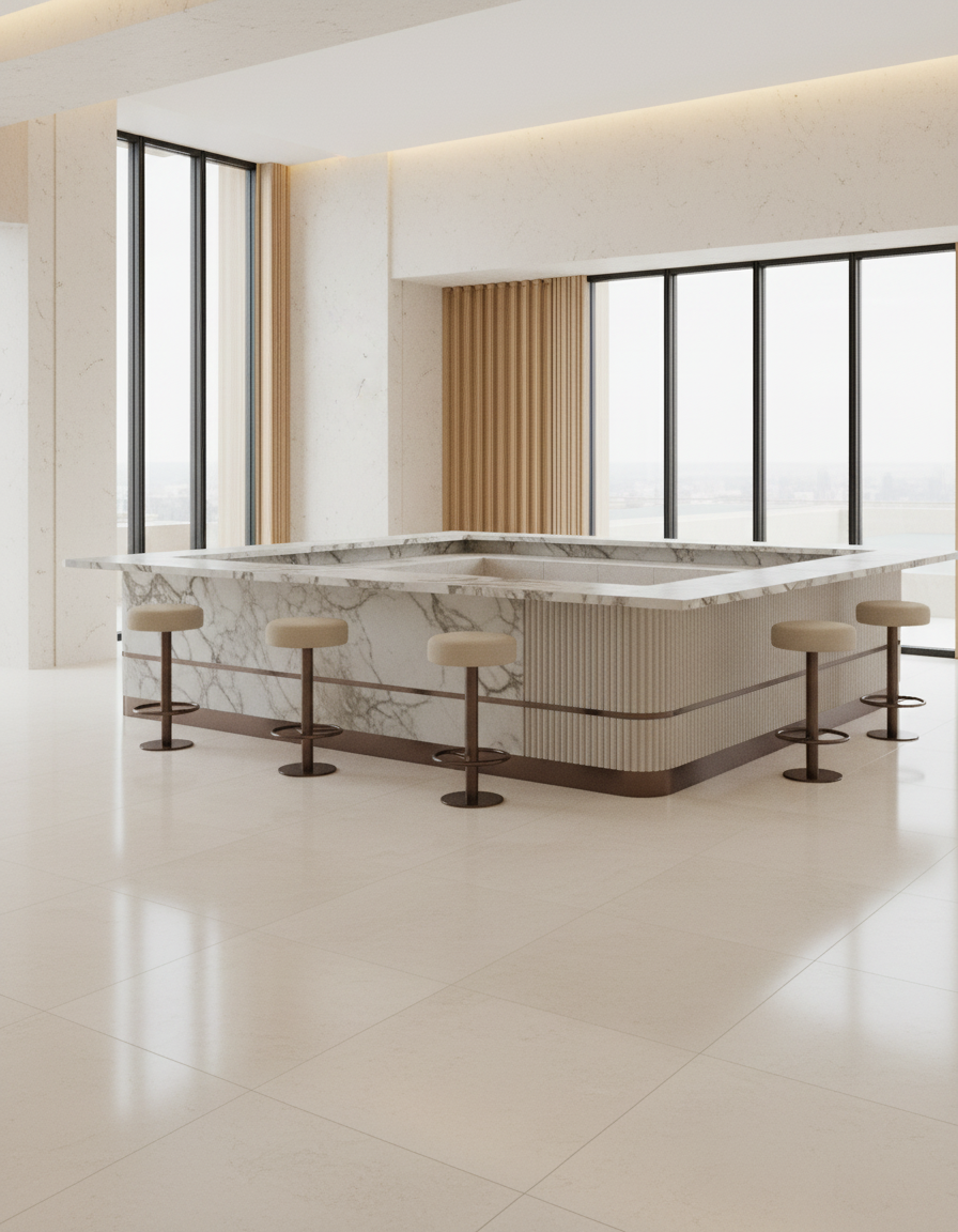 the ceiling is a soft off white illuminated with hidden warm led lights casting a gentle glow the walls are adorned in a sophisticated light wood paneling creating an inviting atmosphere large floor to ceiling black framed windows line the perimeter flooding the room with natural light the floor is a smooth elegant gray concrete adding a contemporary touch the ambiance is serene and airy perfect for a minimalist yet luxurious setting