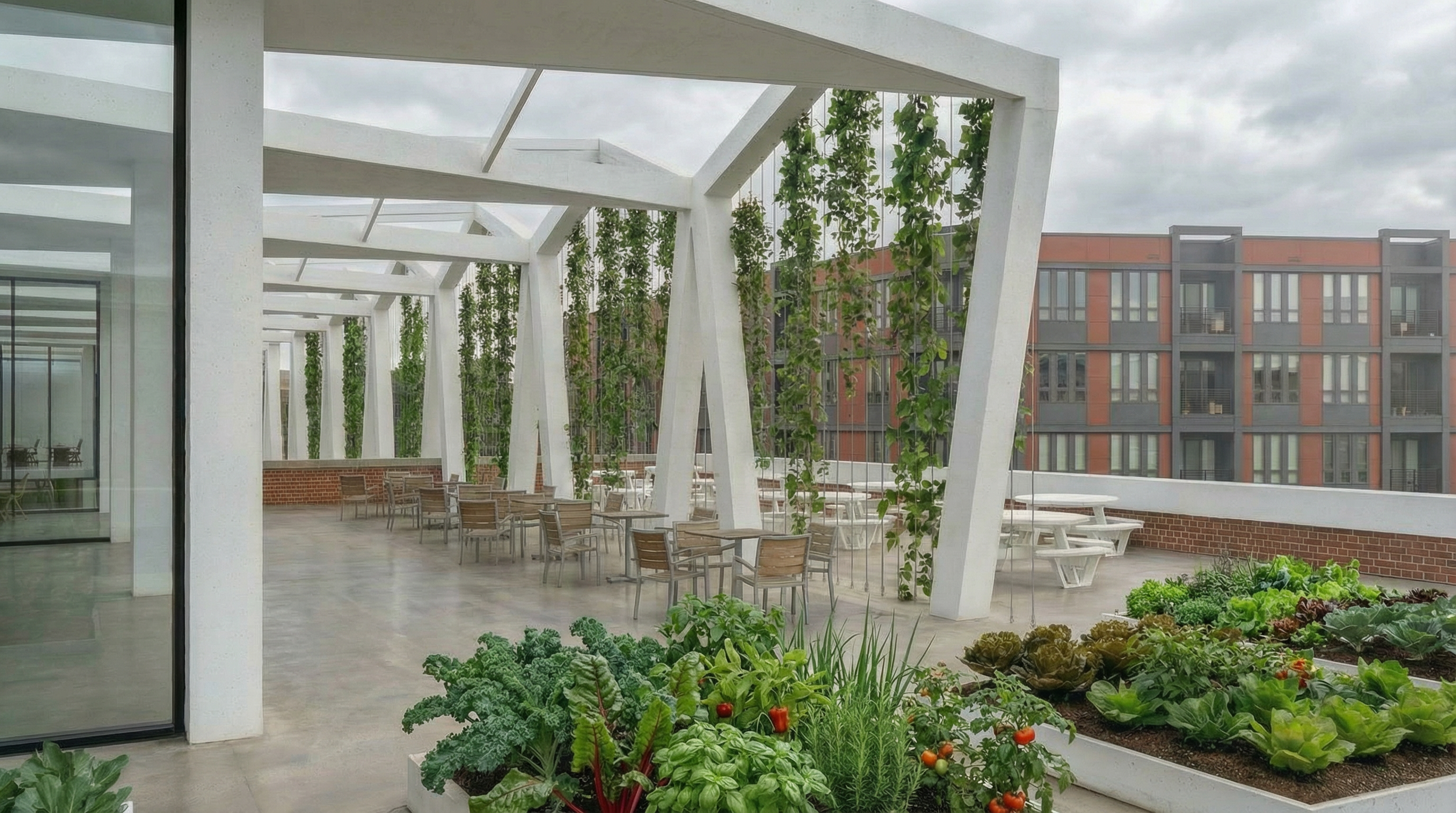 do not change any architecture framing planter sizes planter positions tables vines chairs cables or background building absolutely no changes outside the plants themselves only update the plants inside the right planter boxes make the right planters match the planting style and overall fullness of the left planter box use similar density layering and variety a mix of herbs leafy greens chard kale peppers tomatoes and mid height greens keep the plants on the right medium height not tall the height should visually match the average height of the left planter not the tallest plants avoid tall vertical plants or oversized leaves maintain natural variation but ensure the right side feels equally lush and cohesive with the left do not change the left planter or anything else in the image