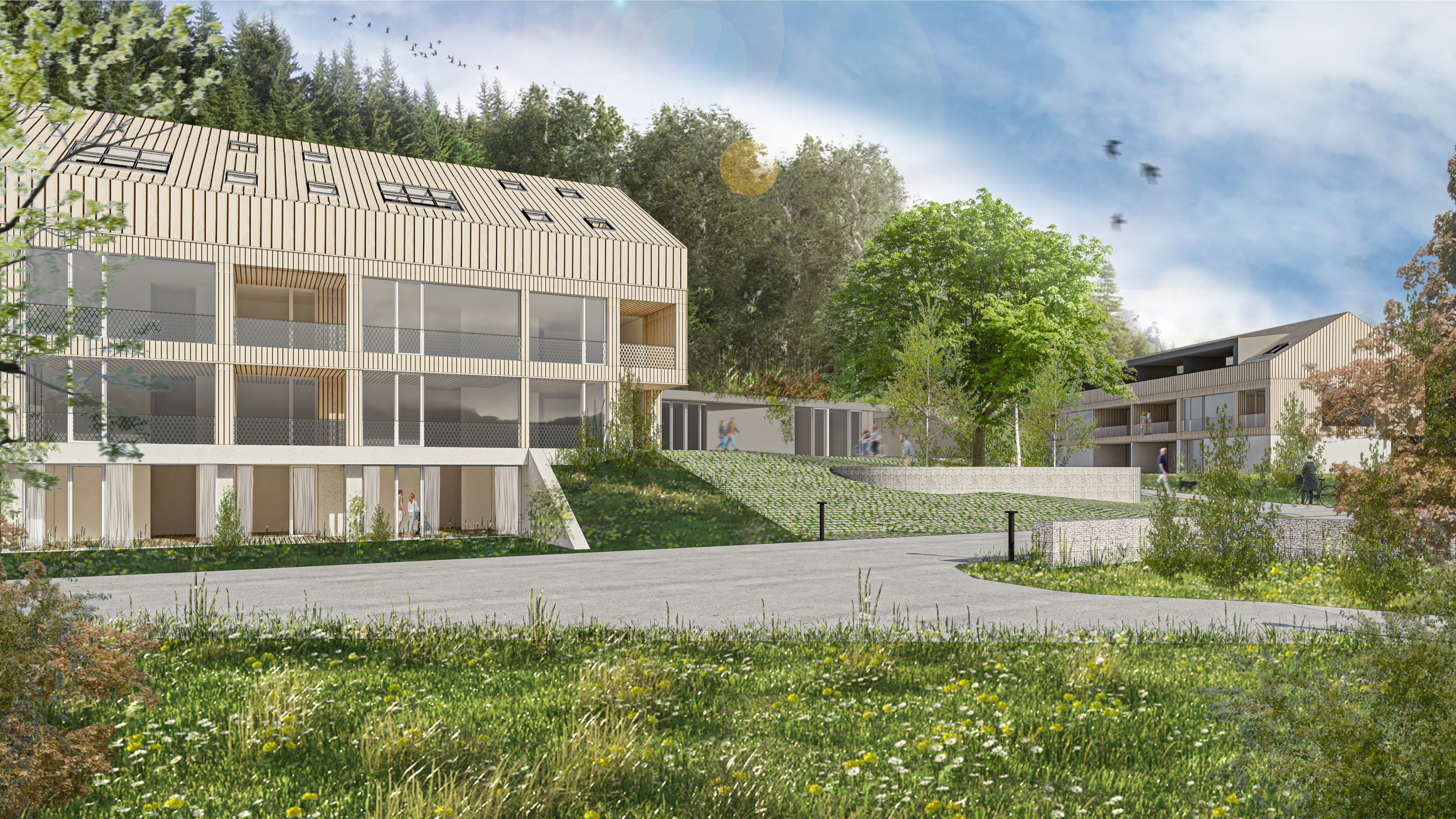 overall more precise and realistic visualization wood on the facade more gray clouds winter light through the clouds realistic glass reflections winter landscape and grasses