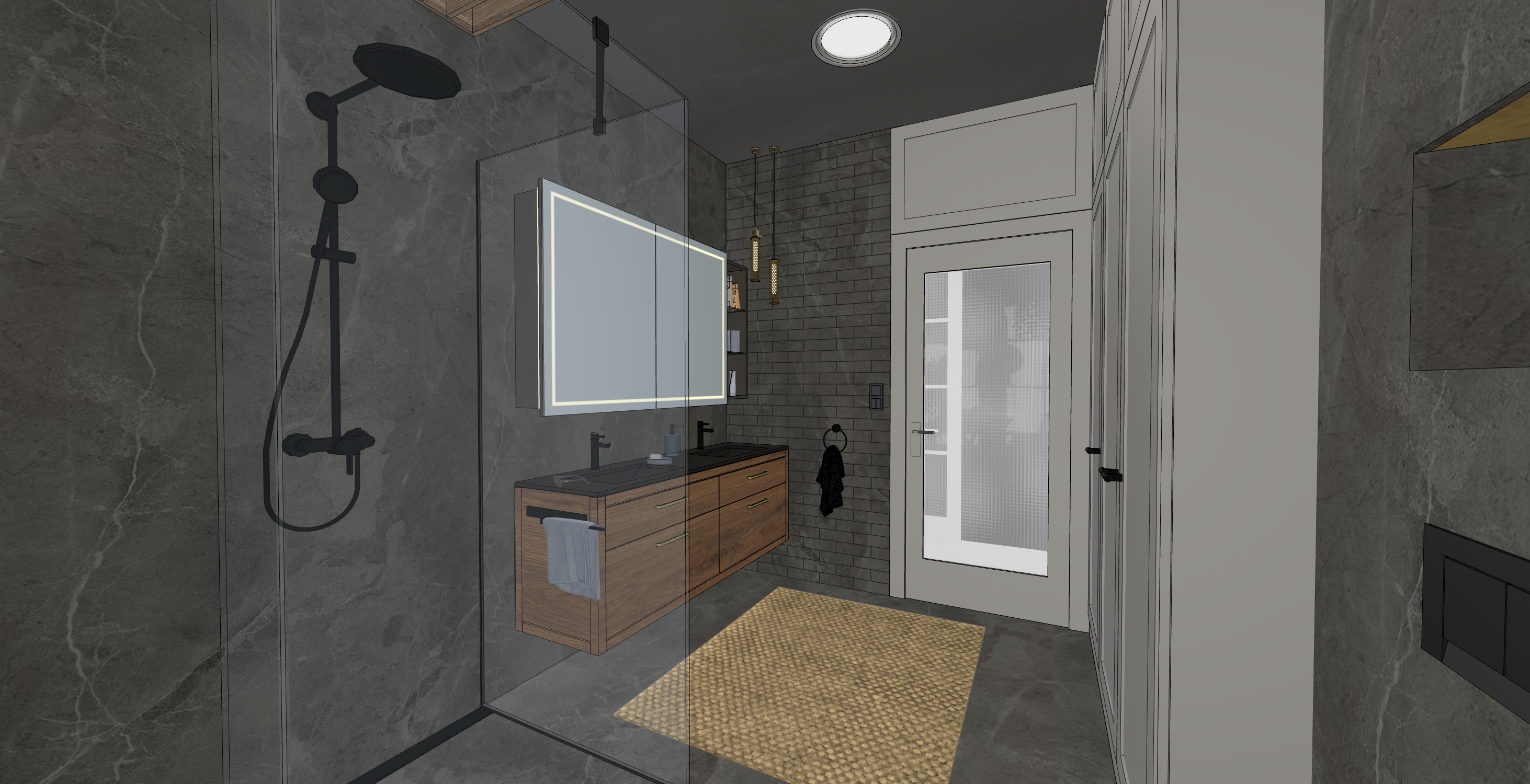fot realisztikus k p egy modern indusztri lis kieg sz t kkel berendezett f rd r l ne v ltoztass a modellen s t t intim hangulat t r k rben fekete plasztikus has tott pala hat s matt burkolatokkal fekete m zas ker mia szaniterekkel matt fekete csaptelepekkel s zuhany szettel a padl is fekete matt pala hat s tl tsz enyh n t kr z d vegkabin fal friss apr v zcseppekkel az veg alj n a zuhanyz ban egy kisebb v zfolt a padl n vonalmenti fekete design foly ka a falsarokban a mosd pult feletti t k r s kja m g tt rejtett meleg f ny vil g t s a t k r el re is vil g t a wc nyom lap feletti falf lke csiszolt rusztikusabb rezes arany f m fel let a f lke fels h ts l ben elhelyezett rejtett led vil g t ssal kiemelve a falra szerelt mosd pult eur pai di fel let matt arany foganty kkal a b tor alj n lefele vil g t tompa meleg f ny led vil g t s van a sz nyeget cser ld le egy meleg barn ssz rke puha magassz l vel ros hat s f rd szoba sz nyegre a szekr ny s ajt fel lete sz rk s ol va az ajt strukt r lt vege sz rtan tsejlik az ajt n meleg mesters ges f ny sz r dik be a mennyezeti vil g t test halv nyan vil g t
