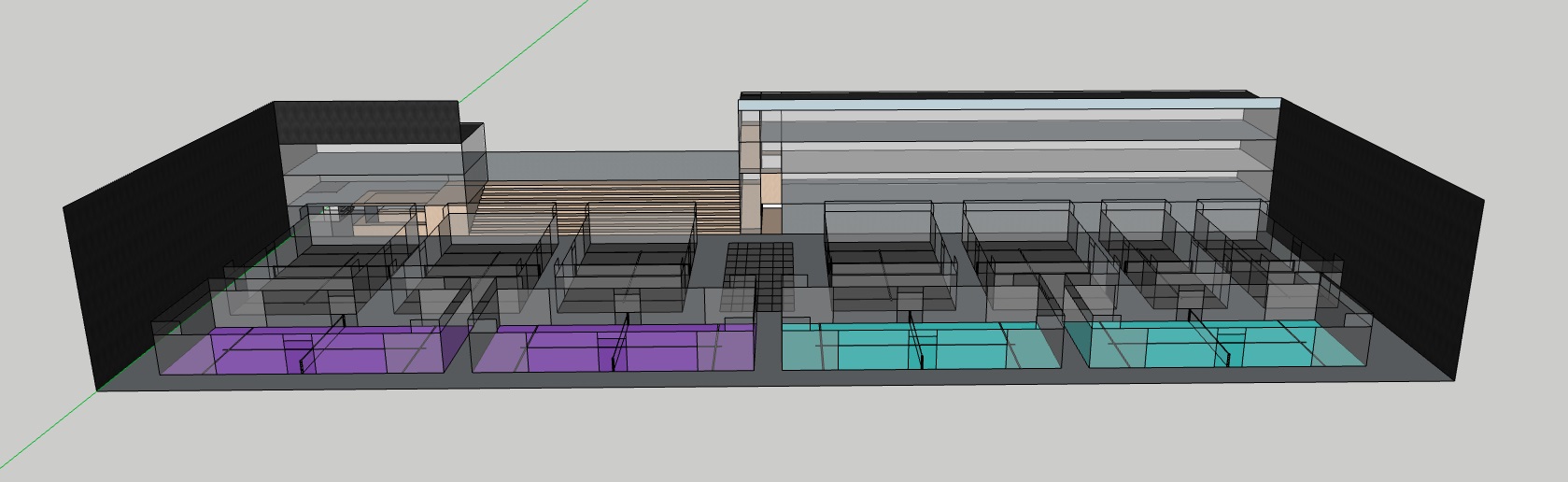 photorealistic architectural visualization front facing perspective view eye level slightly elevated large premium indoor padel social club complex medio 8k quality cgi render overall structure massive rectangular hall enclosed between two large black concrete side walls east and west dark matte finish the entire complex is semi open courts visible from front glass enclosures throughout central bridge like 3 story building structure spanning full width of the hall at mid depth dividing front and rear court zones court layout total 11 courts front row closest to viewer 2 courts purple violet synthetic turf on left half 2 courts teal turquoise synthetic turf on right half all in tempered clear glass panels with black steel frames rear row behind bridge building 4 5 courts with black graphite dark synthetic turf partially visible through glass single padel courts 2x narrower far end of front row teal turf white court lines on all surfaces black powder coated steel frame structure throughout central bridge building spanning full hall width ground floor caf restaurant floor to ceiling glass facade warm amber interior lighting people inside wood and concrete interior 2nd floor coworking open space large horizontal windows concrete facade with light oak wood accent panels 3rd floor business center cantilevered glass and concrete overhang panoramic strip windows slight cantilever over lower floors horizontal layered facade alternating concrete glass wood bands tribune left side front zone stepped wooden grandstand 5 6 rows of light oak bleachers faces the front padel courts covered by flat canopy roof black steel structure people seated watching games materials dark charcoal polished concrete flooring throughout light oak wood tribune steps reception desk ceiling panels black powder coated steel all structural frames court enclosures tempered clear glass court walls and building facade black rough concrete massive side walls lighting dusk evening atmosphere bright cool white led floodlights over each court courts glow vividly warm golden light emanating from caf ground floor accent lighting on tribune wooden structure dramatic contrast glowing purple and teal courts against dark industrial structure subtle reflections on polished concrete floor atmosphere premium urban sports and lifestyle destination players mid game on front courts silhouettes visible people in caf people on tribune watching energetic vibrant modern style photorealistic architectural cgi front facing slightly elevated perspective full complex visible clean light grey neutral background shallow depth of field slight blur on far background reference big architects herzog de meuron sports facility renders no sketchup style no line drawing full photorealistic textures