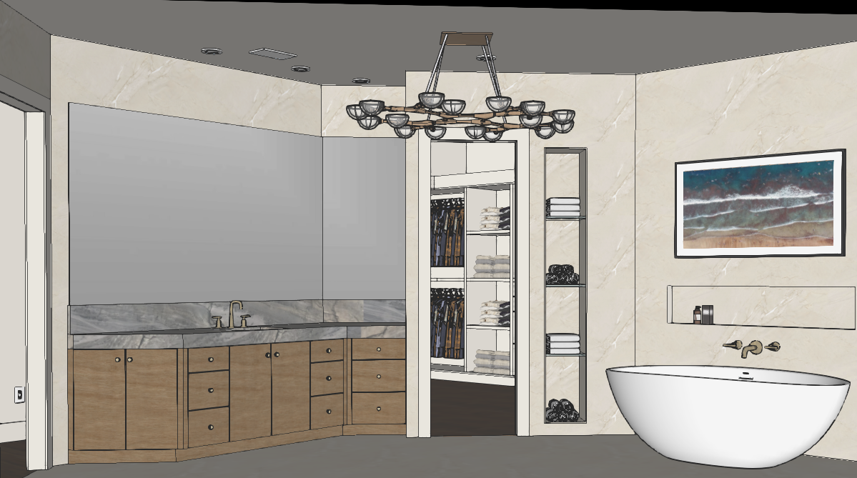 keep everything the exact same but make realistic lit the mirror towel shelves and tub niche