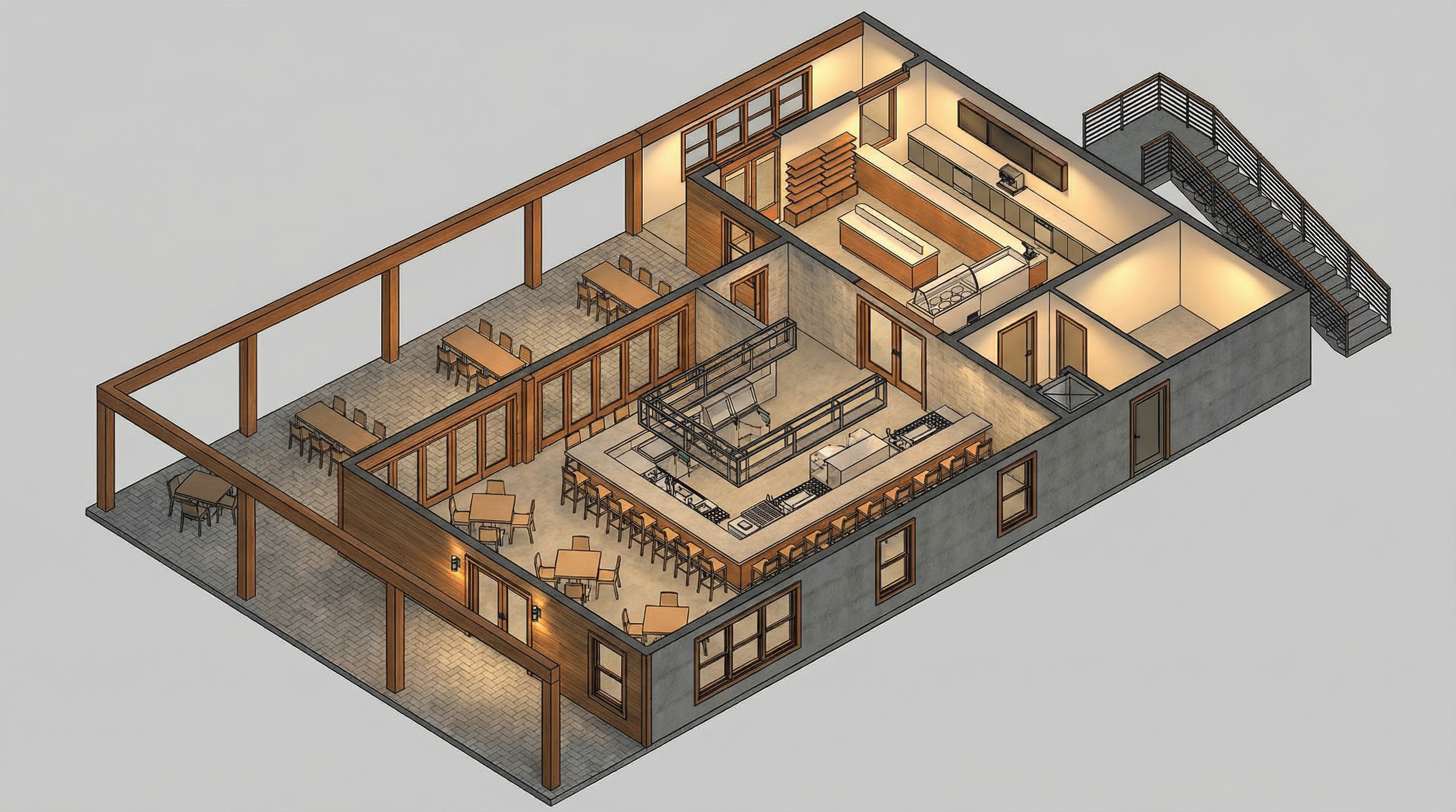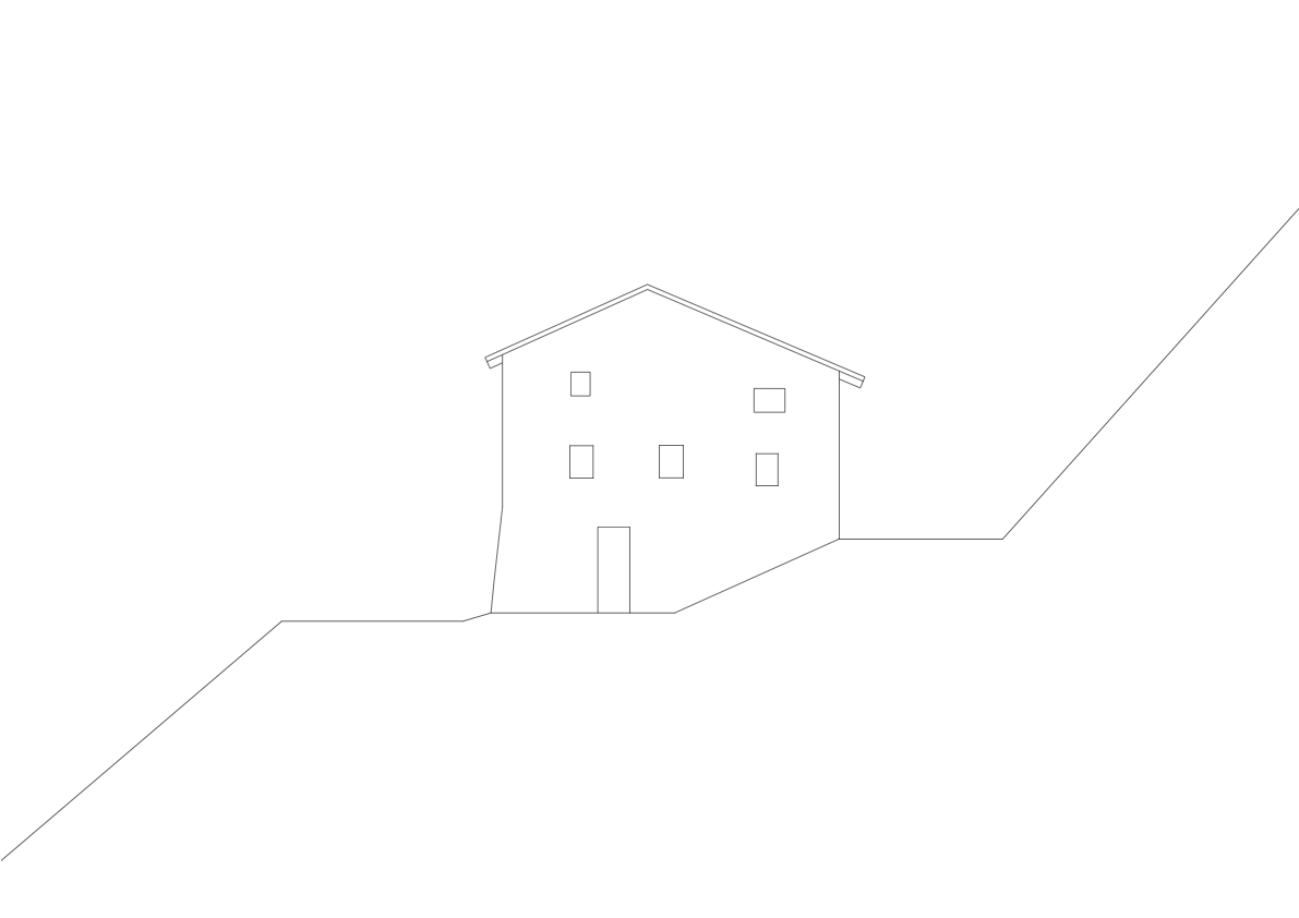 create an architectural elevation of the attached image do not crop or resize the house vertically or horizontally the full elevation must remain visible do not alter the design do not add lines only apply the materials and fill the exterior with nature the material of the walls are natural rock bricks random mix of grey cream and light brown tones with over grouted mortar the roof is made with dark black slate roof seam the under roof is made of oak wood the upper gaps in the wall are windows the internal part is glass at the bottom there is an oak wood door with a dark metal door hand on the right the exterior is all greenery all around the structure there is no vegetation on the structure the ground is full of grass and the upper part of the background with a steep hill side full of trees keep it subtle and soft not overpowering preserve all existing windows keep the overall rendering slightly on the darker moody side for realism