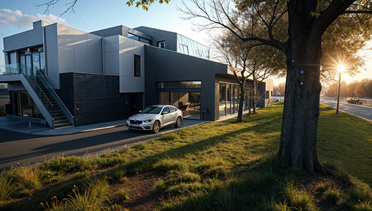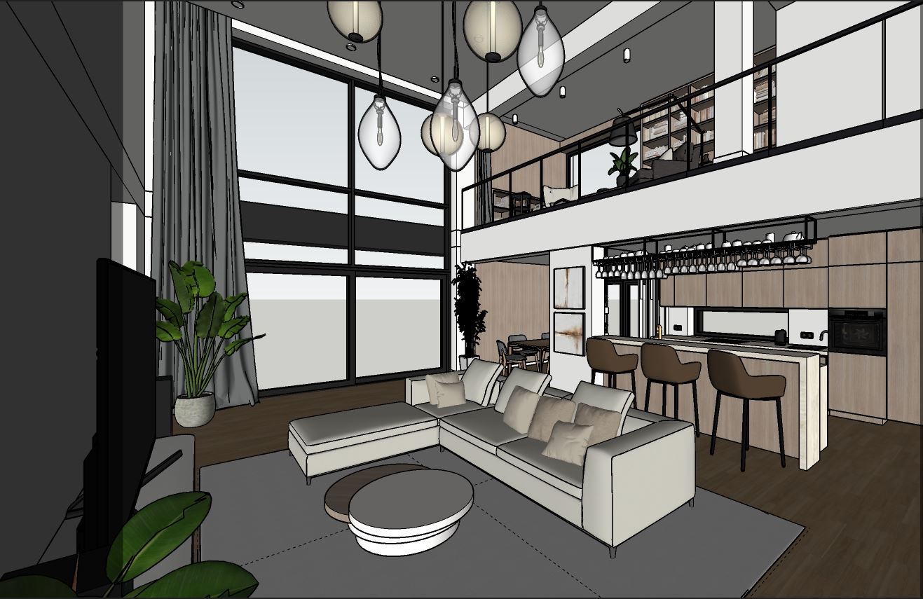 exterior shot modern loft interior with a luxurious and inviting atmosphere large glass windows allowing natural light to flood in softening the ambiance opening whe view on terrace and green garden comfortable l shaped sofa in a creamy beige color surrounded by plush cushions in neutral tones the wooden floor is light and rich enhancing the warmth of the space elegant pendant lights hanging from the high ceiling casting a gentle glow curtains are a soft gray adding sophistication kitchen area features sleek wooden cabinetry with hints of light oak bar stools in dark camel leather lush green plants add vitality and freshness overall mood is cozy stylish and modern