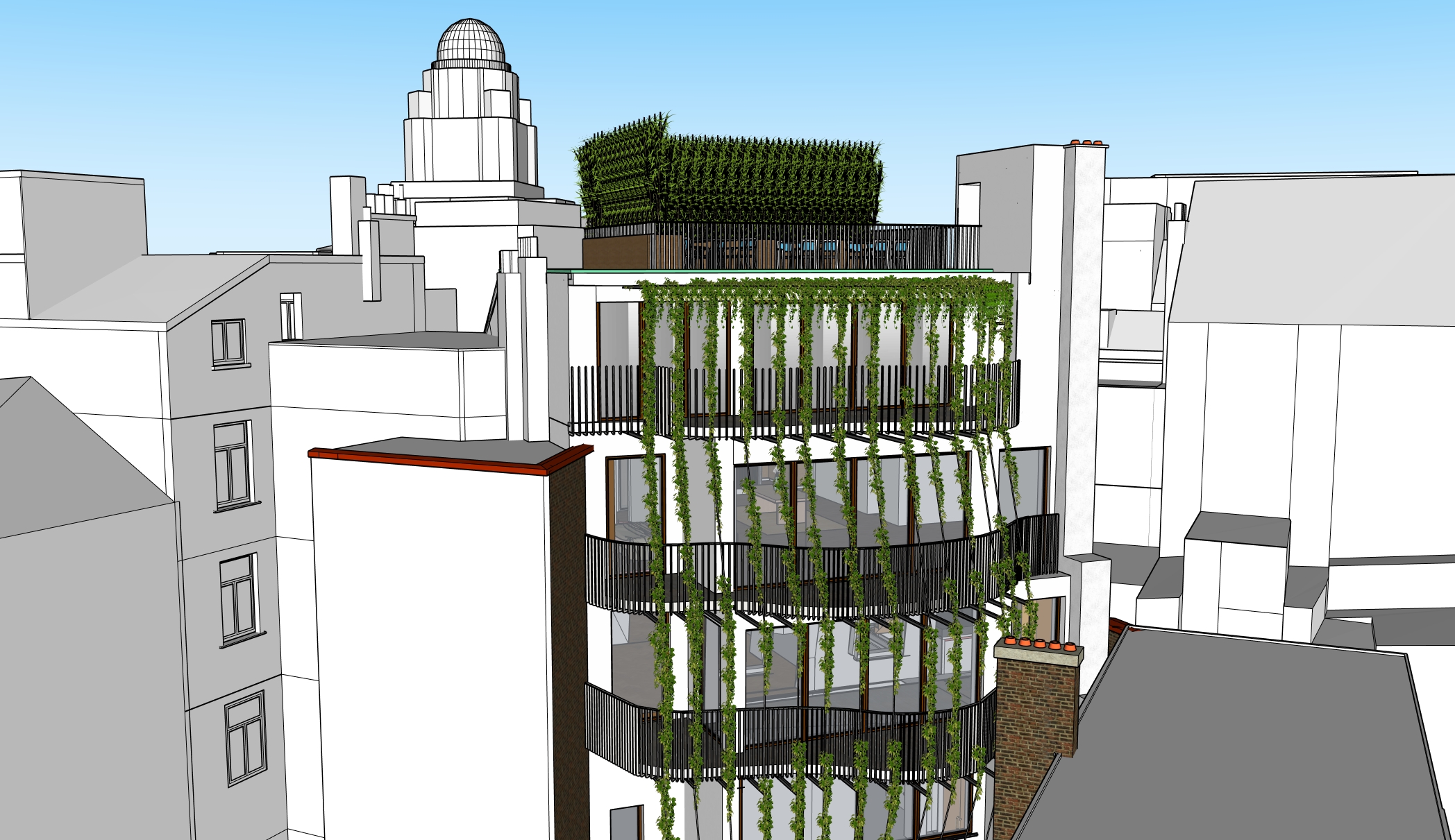 exterior shot modern urban architecture with lush greenery vertical garden on white building facade sleek black railings rooftop terrace with dense bushes surrounding buildings in soft gray and white tones bright blue sky vibrant and fresh atmosphere