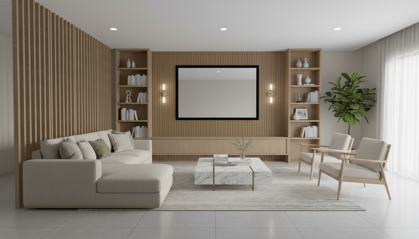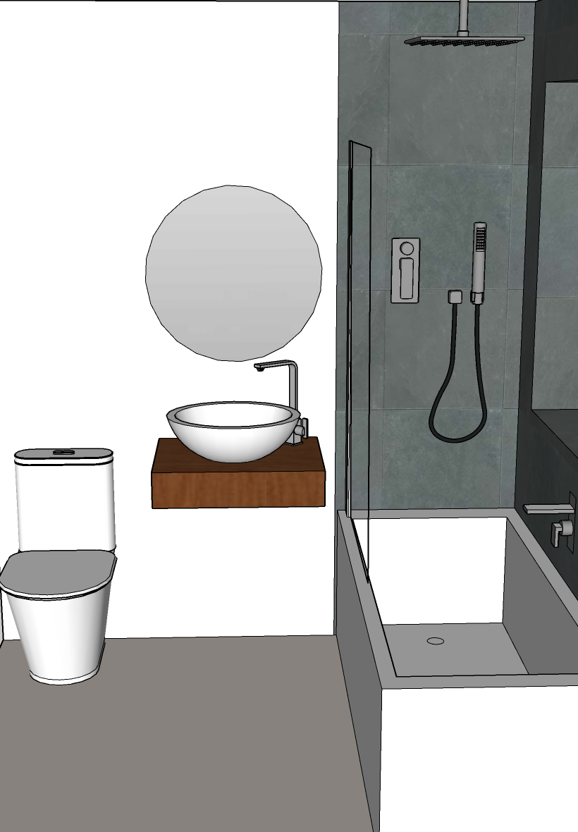 a modern bathroom with a sleek design feature a white ceramic toilet with graceful curves choose soft white walls for a clean and fresh look add a gray stone tile accent wall around the white bath include a large round frameless mirror above a floating wooden vanity in warm walnut tones with a white vessel sink the floor is matte beige tile bathe the room in natural light filtering through a window add soft shadows to create a calm and inviting atmosphere with a minimalist elegance