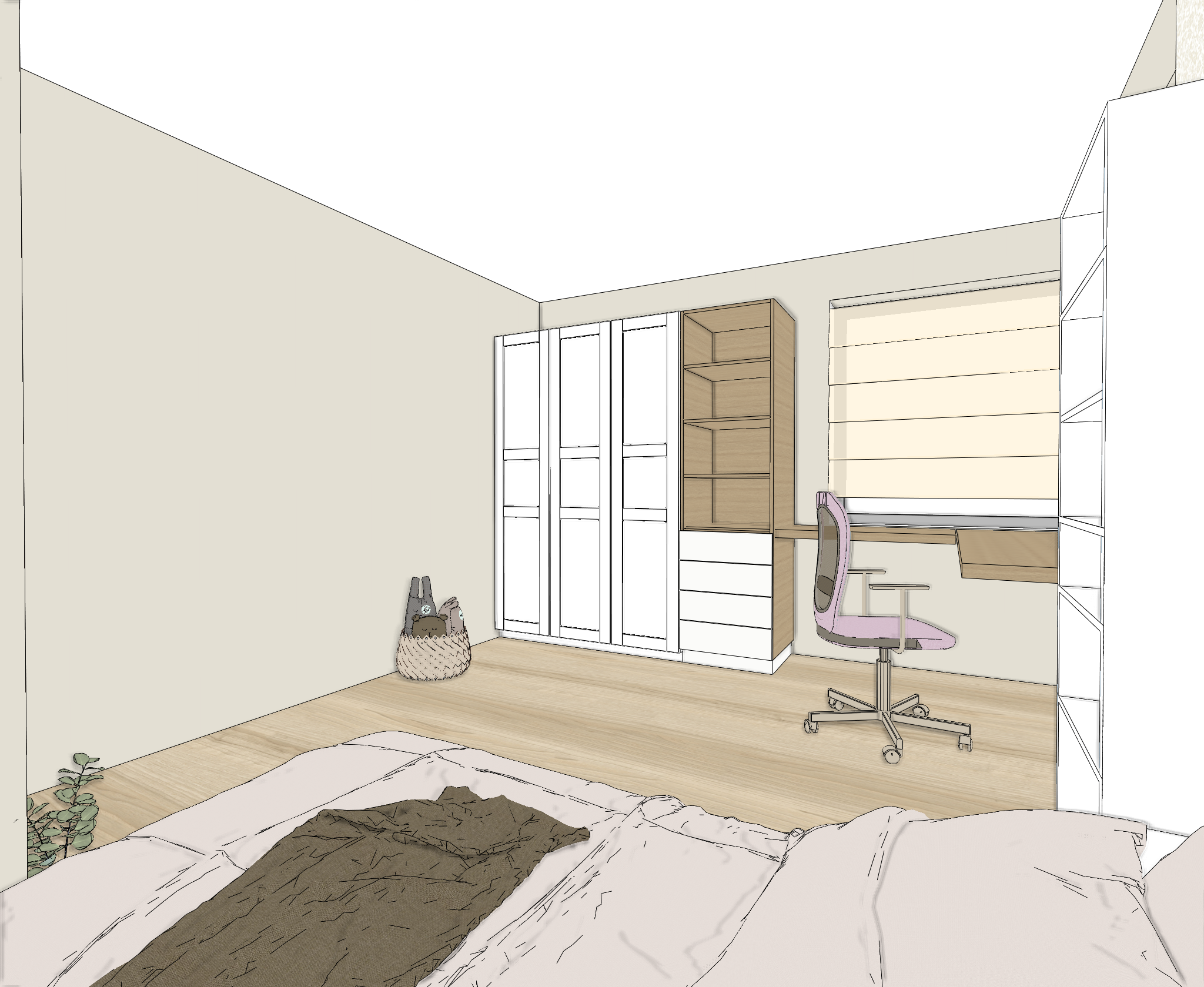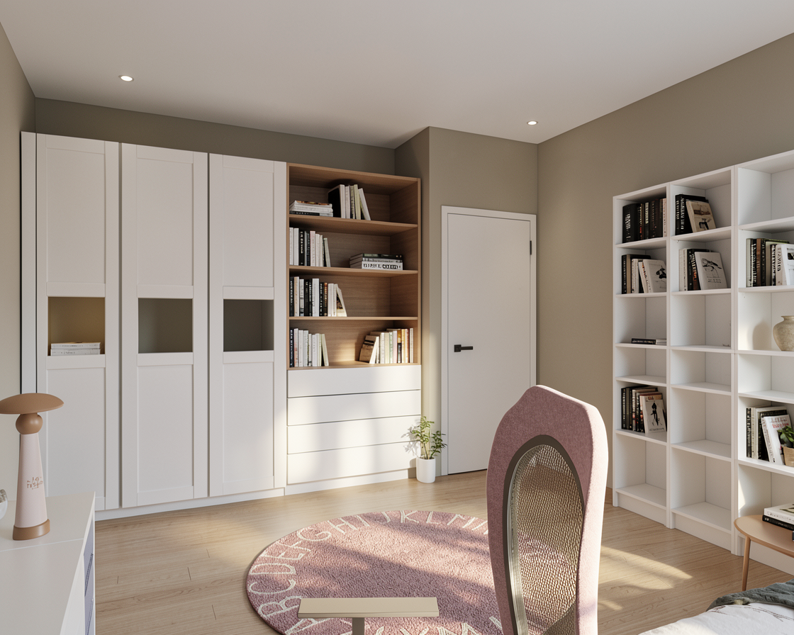 render keep colors and materials add details to the study desk and books to the shelves