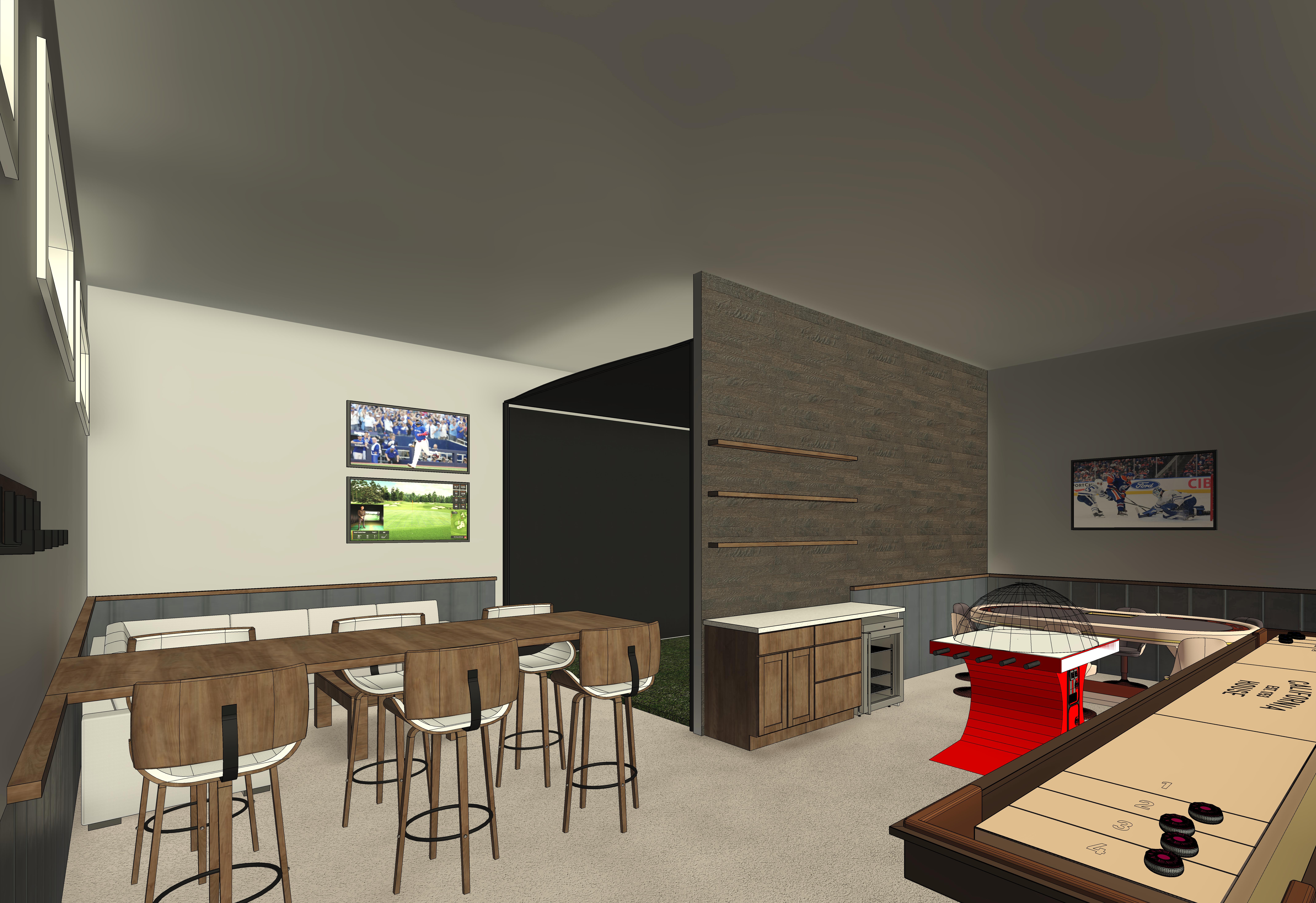 a modern rustic man cave games room the room contains a golf simulator with a fake grass green floor and black fabric walls other items include shuffleboard with black weights nhl super chexx pro bubble hockey with black base and oilers logo on the base poker table behind the bubble hockey trimmed in black leather the sectional sofa in the distance is ultra realistic super puffy medium dark grey ultra comfy leather like vinyl with 2 complimenting cloth throw cushions decor at the sofa end arms and two soft throw blankets a coffee table with tinted glass top the tv s on the far wall are displaying a high definition blue jays game on the top tv and a high definition golf simulator game on the bottom tv the tv on the right wall above the poker table is displaying a high definition edmonton oilers game the bottom 42 of all exterior walls are finished in galvanized vertical corrugated metal capped at the top with a small wood sill with underlighting that accents the corrugated metal no lighting at the bottom of the corrugated metal the bar wall is a feature wall finished above the corrugated metal with horizontal medium large planks of rustic reclaimed wood the other walls are painted benjamin moore simply white the cabinets against the reclaimed wood wall are a walk up bar with three open wood shelves above each shelf has a soft subtle led strip along the top back edge that lights up the alcohol bottles on all three shelves no toe kick lighting on the bar cabinet personal ice maker on the right side of the light colored granite bar top cabinet hardware is a flat black metal finish soft natural light coming through the windows and pot lights throughout providing gentle ambient soft mood lighting make all the wood for bar cabinets bar shelving table chairs and corrugated steel trim a medium dark wood grained birch the floor should be a medium dark gray cut and polished concrete floor do not add windows preserve the original image as a background plate keep everything else unchanged forbid geometry reconstruction