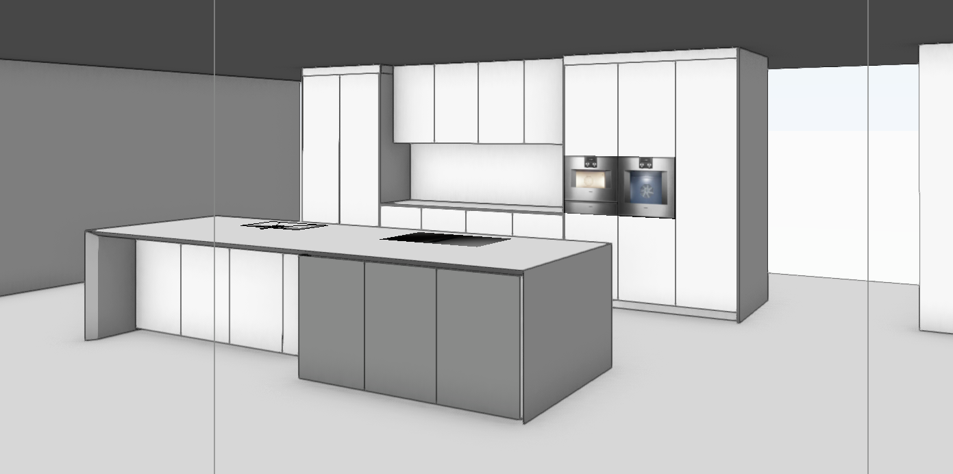 ignore the two lines in the front an make the wood dark brown render a luxurious kitchen interior with a warm cozy and elegant atmosphere use soft indirect lighting to create a sophisticated and intimate mood enhancing the richness of the materials and highlighting fine details the floor is made of light colored stone tiles each 120 cm x 120 cm with a smooth matte finish that gently reflects light the countertop is crafted from classic emperador dark marble featuring deep brown and orange tones with rounded flowing veining patterns characteristic of genuine emperador dark the surface should appear polished vibrant and luxurious all wood elements including base cabinets shelves and hanging elements are made from very dark brown wood with a calm uniform grain for a refined and timeless appearance in the back composition both the standing base cabinets and any non hanging units should be finished in a warm uniform brown tone smooth and elegant without visible grain to create visual harmony and depth only the hanging cabinets above the central gap should be made of smoked oak matching the island to establish a strong material connection within the space the island features a sink on the left side and a cooking station on the right with a sleek integrated tap in brushed bronze or gunmetal for a sophisticated look decorate tastefully with wine glasses carafes and minimal elegant accessories to add realism and subtle refinement use realistic materials soft reflections and warm ambient lighting to emphasize craftsmanship texture and atmosphere ignore the two lines in the front the final render should focus on the back composition highlighting the interplay between uniform warm brown cabinetry smoked oak elements and the emperador dark marble the overall mood should feel dark elegant and inviting filled with warmth depth and understated luxury remove the thing over the island away and make a lamp instead 3m long and thin with warm light ignore the two vertical lines in the foto and make me see that behind me there are big windows the standing cabinets in the back composition have to be uni colored one a brown shade the backpanel from the backcomposition in stone