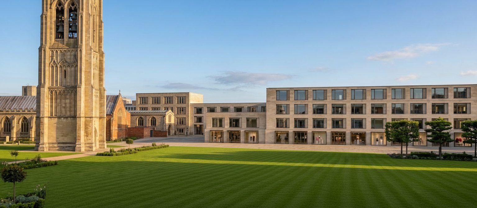 create a park to the front of the buildings with manicured lawns trees and planting flower beds and a lily pond