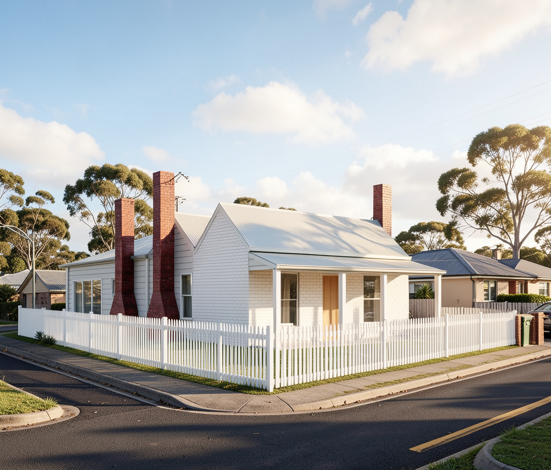regional town in australia landscape exterior render front of house is a lightly rendered white brick all chimneys the same height white picket fence 1 2 meters high 5 meters away from the front of the house dark grey grey colorbond 1 8 meter high fence 5 meters away from the house on the left remove all roads