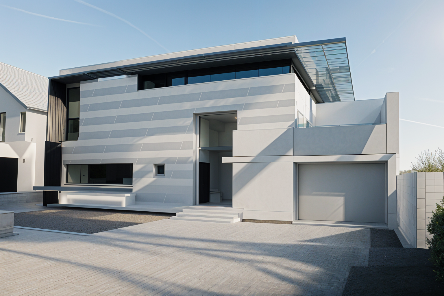 exterior shot hyperrealistic cinematic view black tesla model 3 in front of the garage with plate number tm 79 kst trees in the background grass and plants in the front side of the house glass mirroring the neighborhood glass baluster on the balcony above the garage entrance architecture