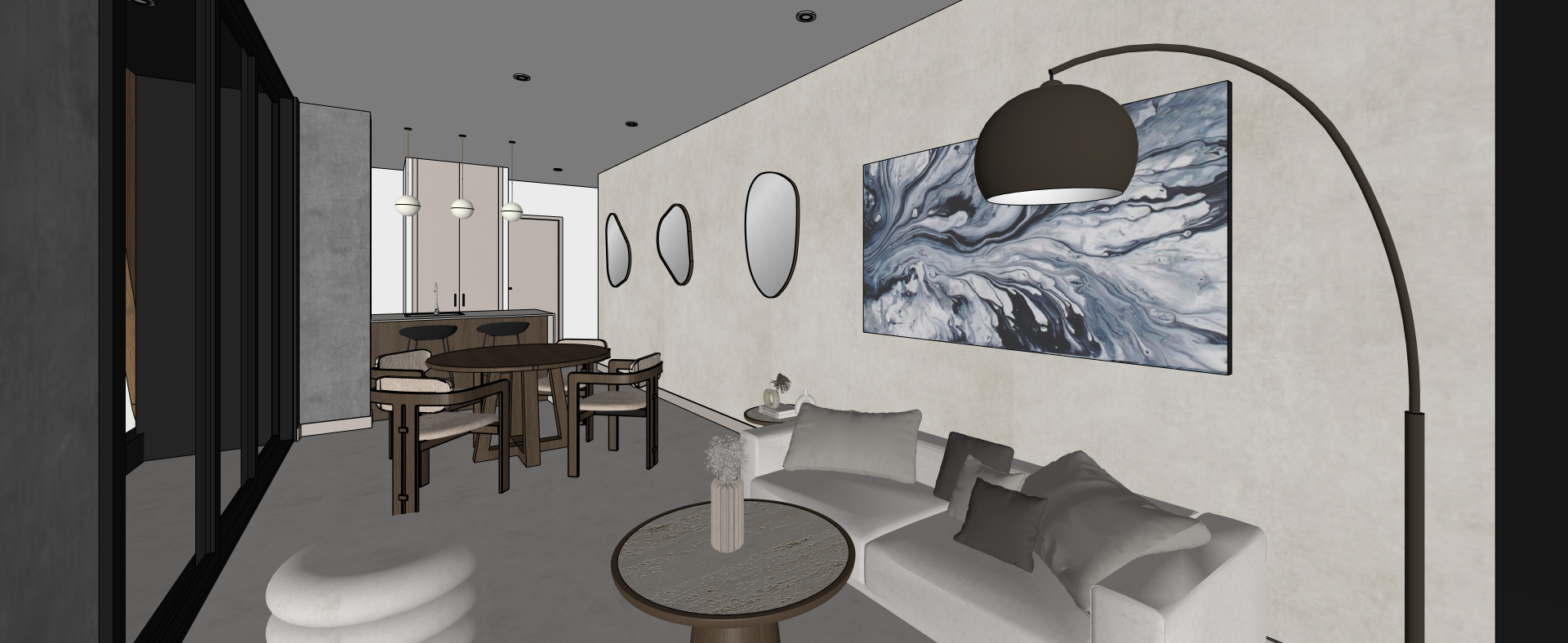 a modern living room and dining area with a minimalist aesthetic the walls are a soft beige color creating a warm and inviting atmosphere a large abstract painting with swirling blues whites and blacks is a focal point on the wall the floor is a sleek polished concrete gray enhancing the contemporary vibe the dining table and chairs are made of dark wood complemented by muted beige upholstery a chic white sectional sofa with gray and black cushions sits adjacent to a round wooden coffee table a large elegant black floor lamp curves over the seating area the overall lighting is soft with warm pendant lights hanging over the dining area creating a cozy and sophisticated ambiance