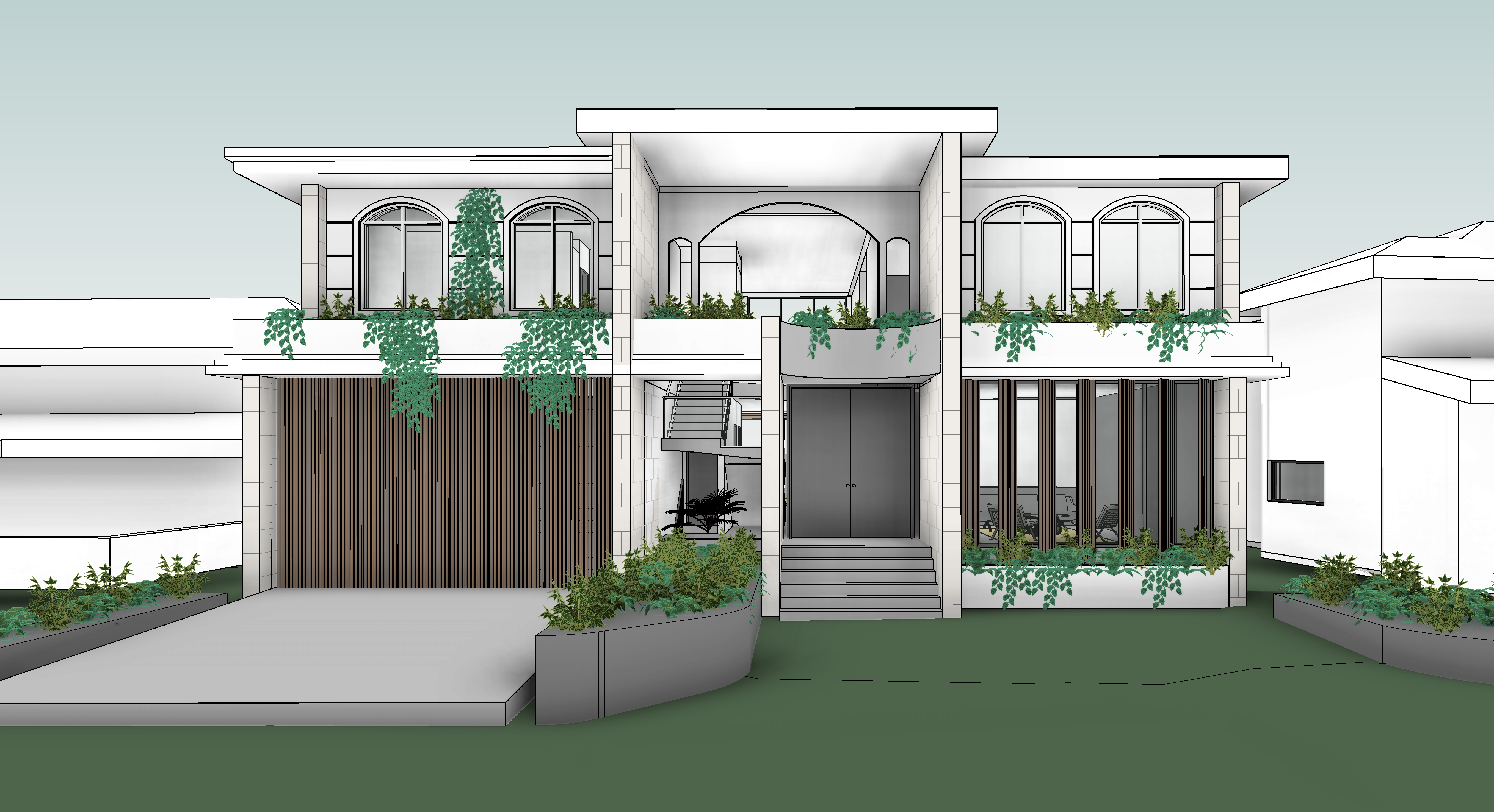 exterior shot french provincial style home mid afternoon visualisation with classic marble interiors warm lights on inside and symmetrical light fittings to exterior elegant is the goal and quality of materiality