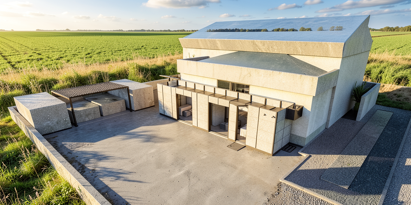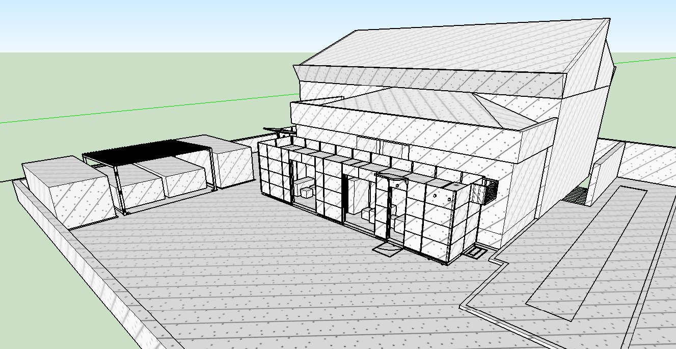 remove the grass add red ceramic roof add windows and glass doors to the first building
