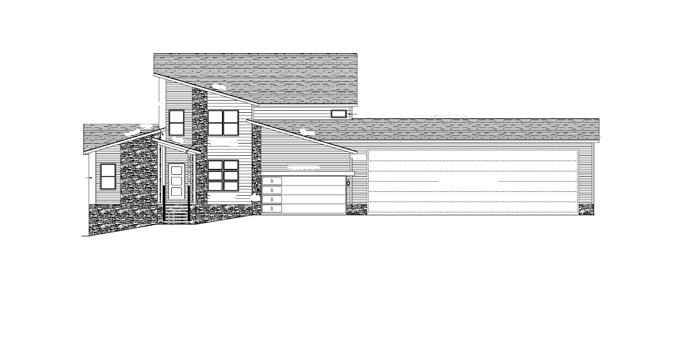 make a front elevation photorealistic as possible while keeping textures the same as shown lightly landscaped in a lightly wooded suburb of north carolina nice lighting remove any text use the following finishes bfbdc3 7 lap siding where shown 4f524f 4 lap siding where shown black windows steinhause stack ledge stone black certainteed dimensional shingles with black soffit fascia and gutters 8b3636 three panel front door 2d2c2e posts