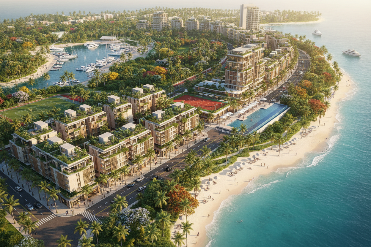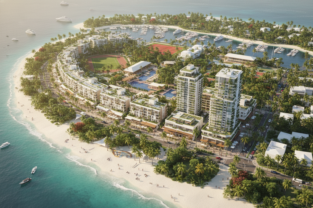 transform this simple sketchup model into a cinematic hyper realistic areal view of a tropical island city keep the overall massing and layout but reinterpret it with modern tropical architecture add row housing retail streets and sports facilities integrated into a lush coastal environment include dense tropical vegetation palms flowering trees coastal plants and layered greenery add beach on the edge of the island marinas for boats to dock detailed street furniture such as benches shading structures planters bike racks lighting and wayfinding populate the scene with cars on he roads diverse people walking shopping exercising and relaxing use warm natural light soft atmospheric haze and a high end filmic look