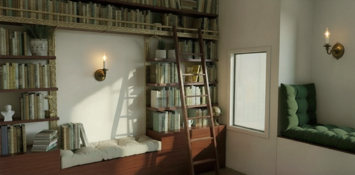 victorian interior shot a cozy and elegant library nook with warm ambient lighting the wooden bookshelves are a rich mahogany filled with an array of vintage books in muted earth tones a polished wooden ladder leans against the shelves the walls are a soft cream color adorned with ornate antique gold sconces casting a gentle glow a plush tufted deep green cushion sits on the window bench inviting relaxation the atmosphere is serene and inviting perfect for reading and reflection architecture