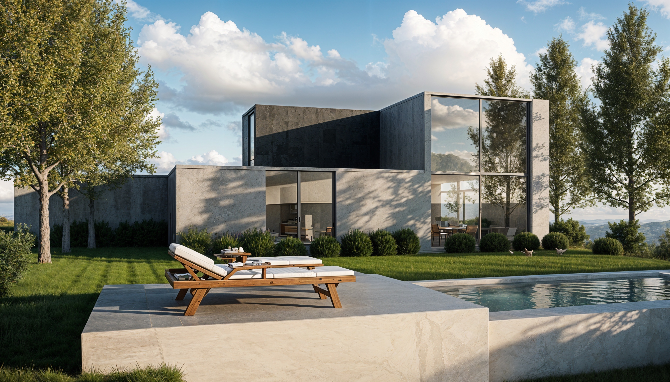 exterior shot modern minimalist white couches sleek design light grey concrete floor lush green bushes adding a touch of nature the sky above is clear and bright blue creating a fresh and tranquil atmosphere