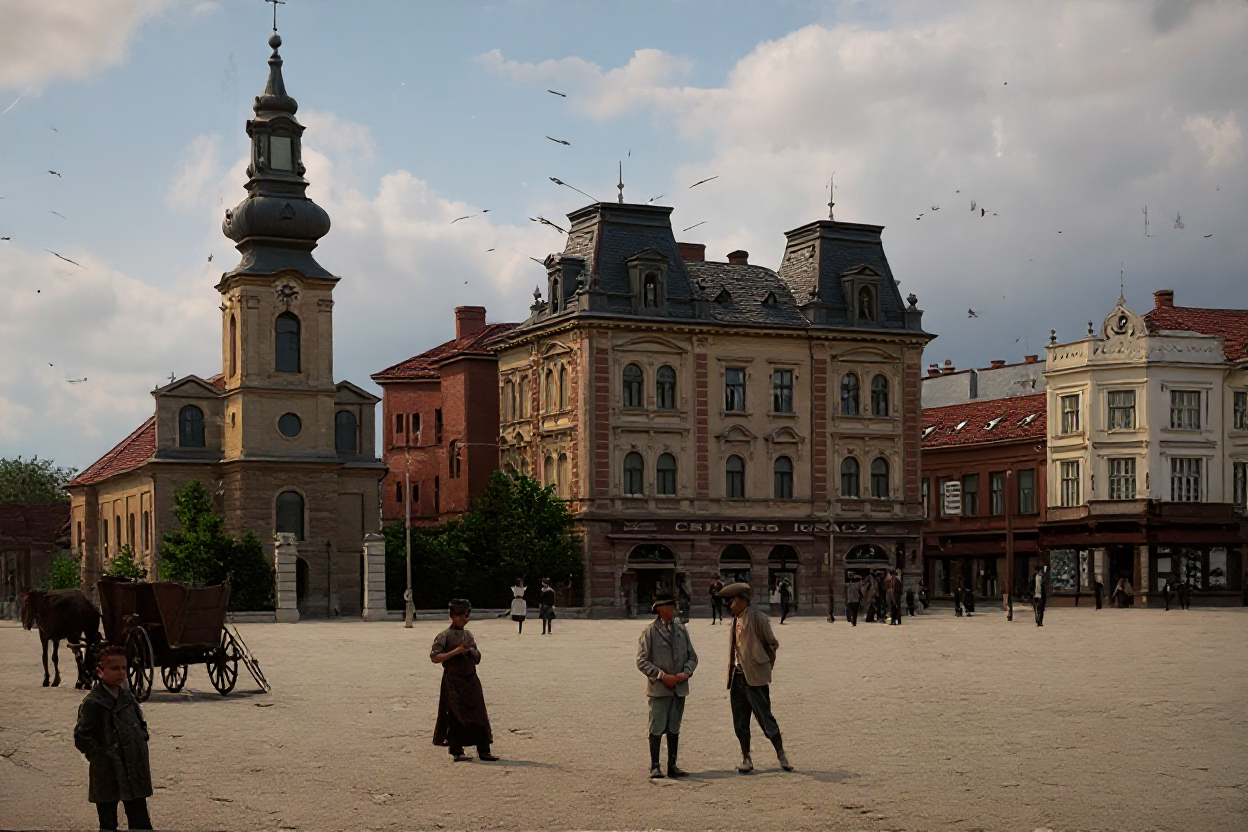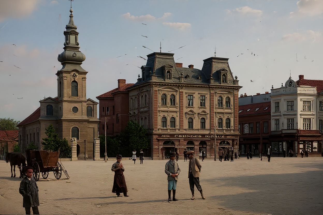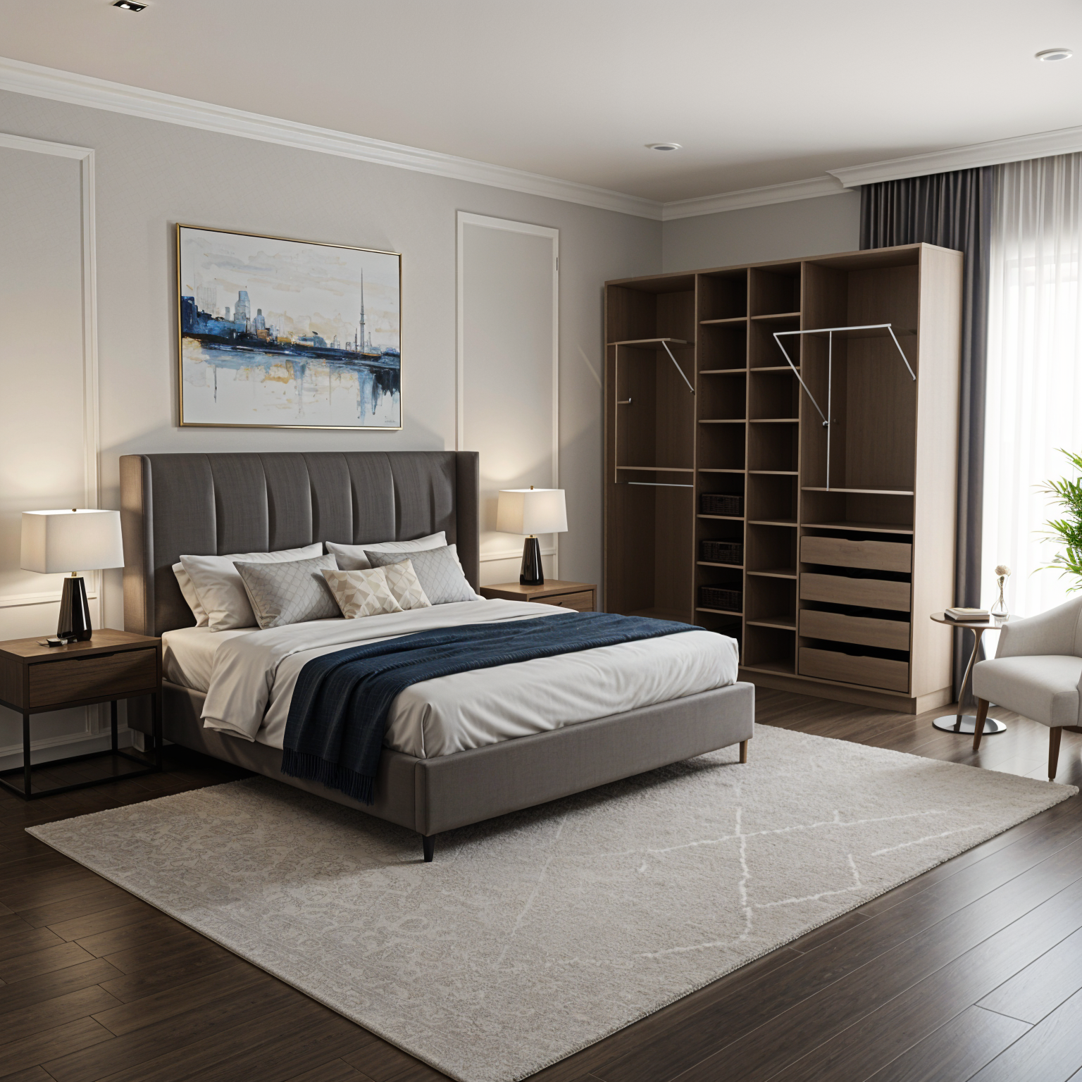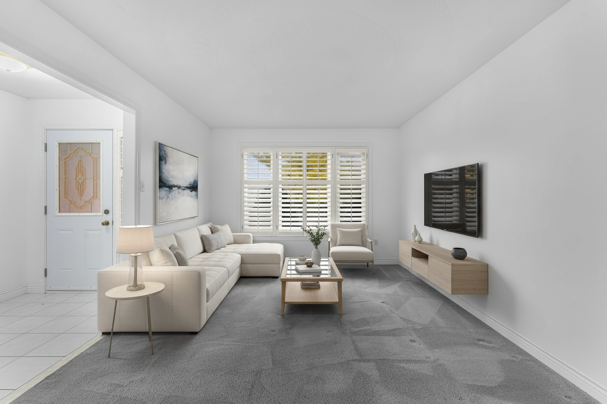 retain the floor colour and the window placement keep the structure of the room the same please stage a dining room in the middle of frame and a hutch for a living room on the left modern light furniture