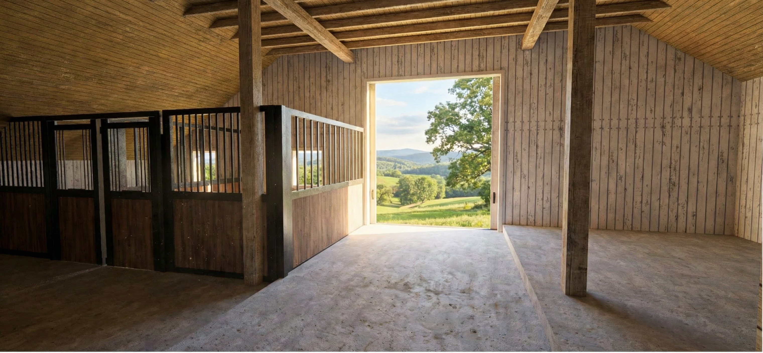 render elevation with off white painted brick off white standard shutters sand tone aluminum windows dark charcoal roof medium tone oak front door dark bronze metal porch roofing off white porch trim color show boxwood bushes in front and driveway on right side medium oak color garage door