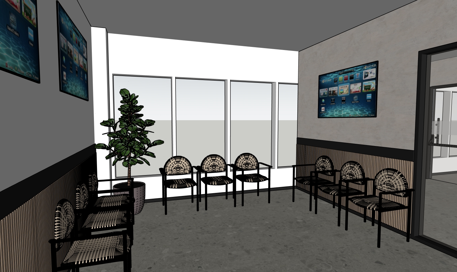 create a high resolution photorealistic render of this interior maintain the exact composition camera angle architectural elements and furniture arrangement do not change any walls windows fireplace openings proportions or furniture placement enhance all materials and finishes for ultra realistic detail improve texture clarity shadow depth light reflections and surface realism add soft natural daylight streaming through the windows combined with subtle warm artificial ambient lighting to enhance depth and atmosphere maintain the original design while upgrading overall lighting contrast and material quality for a refined lifelike result do not change any of the finishes add a cityscape background but the room is on a ground level