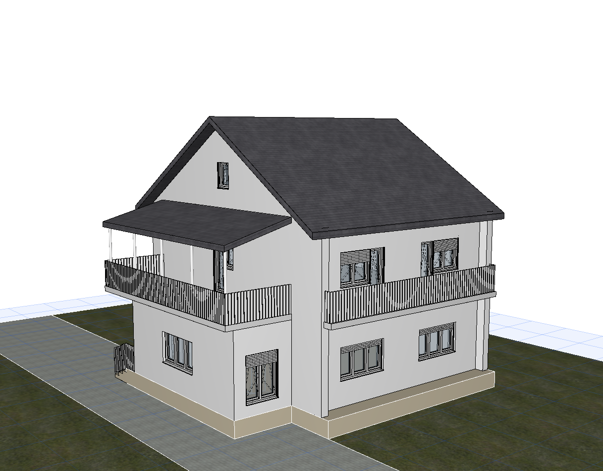 photorealistic architectural render of a family house with a charming european residential character the house features a red tiled roof white window and door frames and white wooden railings on balconies and exterior stairs the facade is finished in a calm green tone harmoniously complemented by vibrant red flowers placed in planters along the balcony and stair railings natural daylight realistic textures soft shadows balanced proportions and a warm welcoming atmosphere