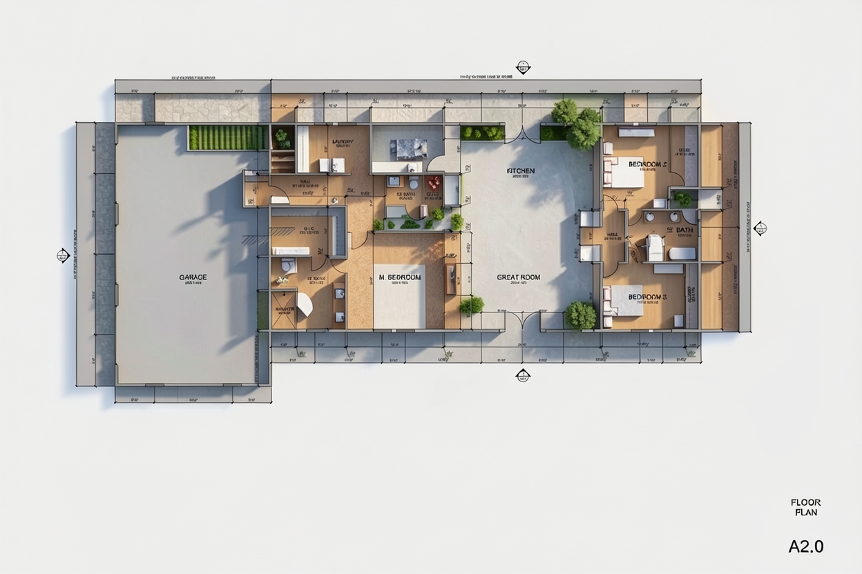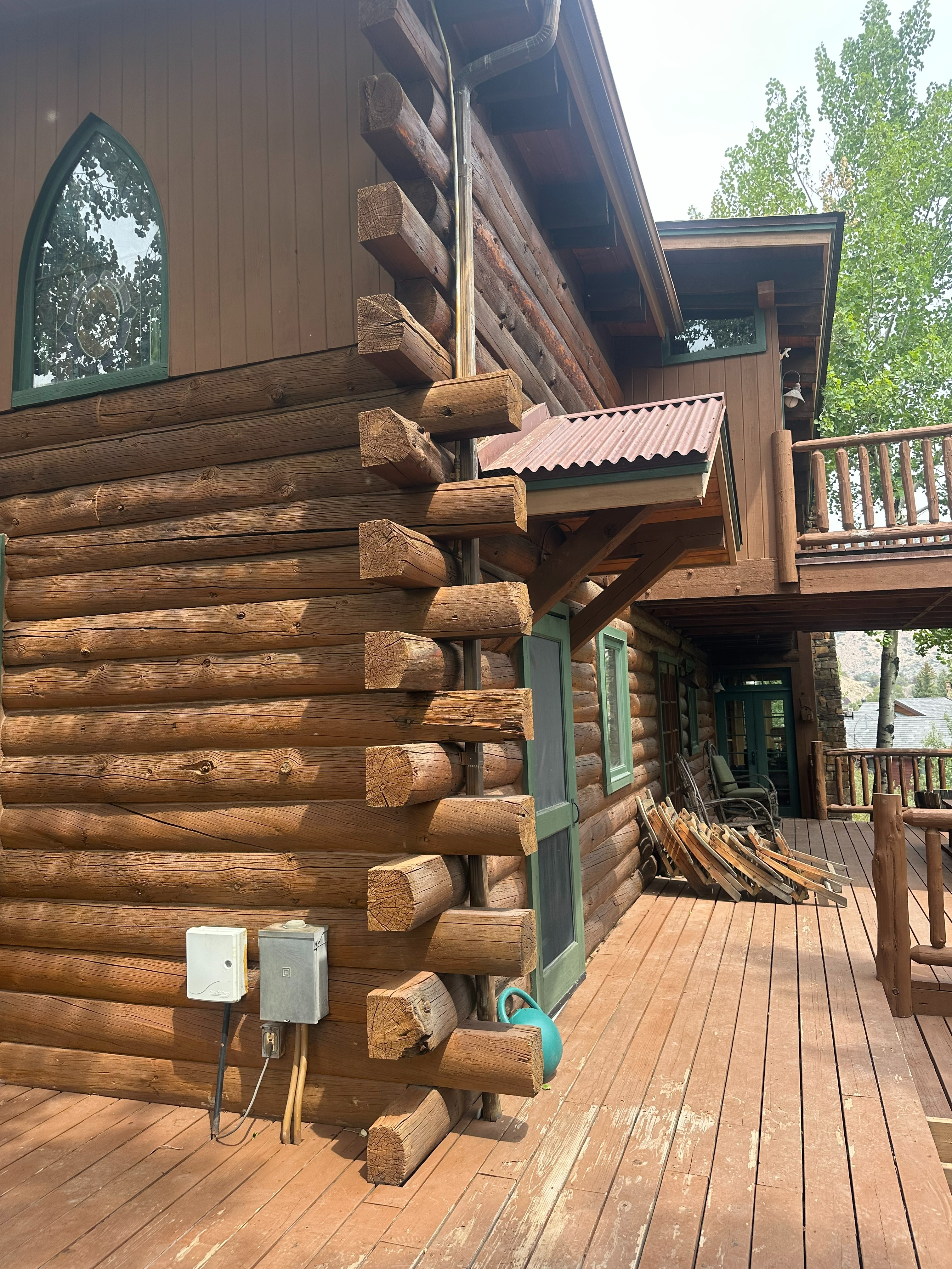 exterior shot from the mood board image take the wood log siding and on all the horizontal wood make all the vertical wood a dark brown color make the stone a gray stone make the windows steel with green trim make a steel railing with steel columns