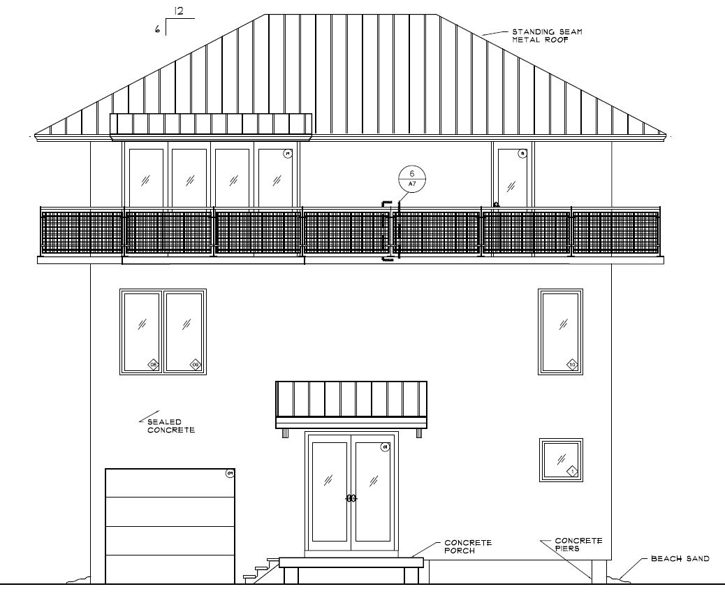 background is florida beach dunes with other houses15 feet apart stucco house cream color navy blue trim and roof