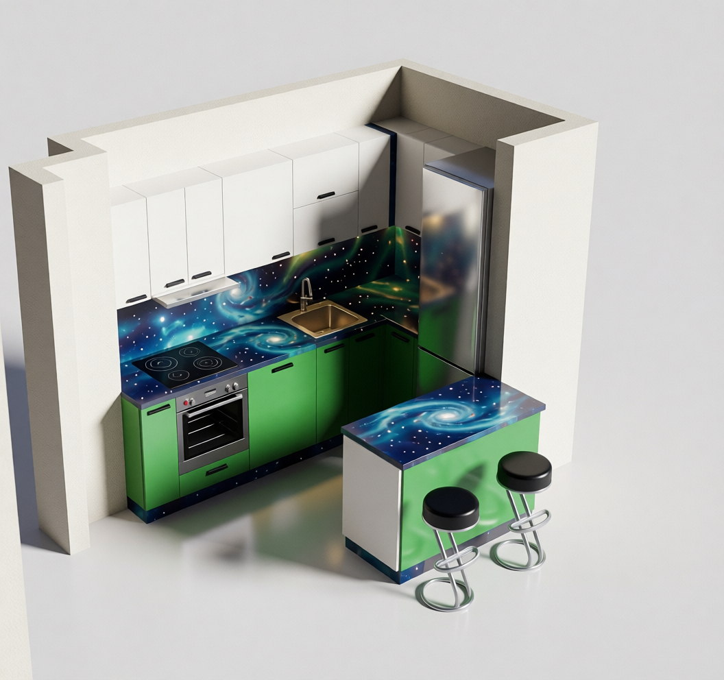 i want you to make a visualization of this drawing as well the kitchen base is white the bottom row is olive green the countertop and backsplash are cloud nebula marble decor the top row is white the second top row is olive green matte mdf the black handle the black sink and the floor is gray wood laminate