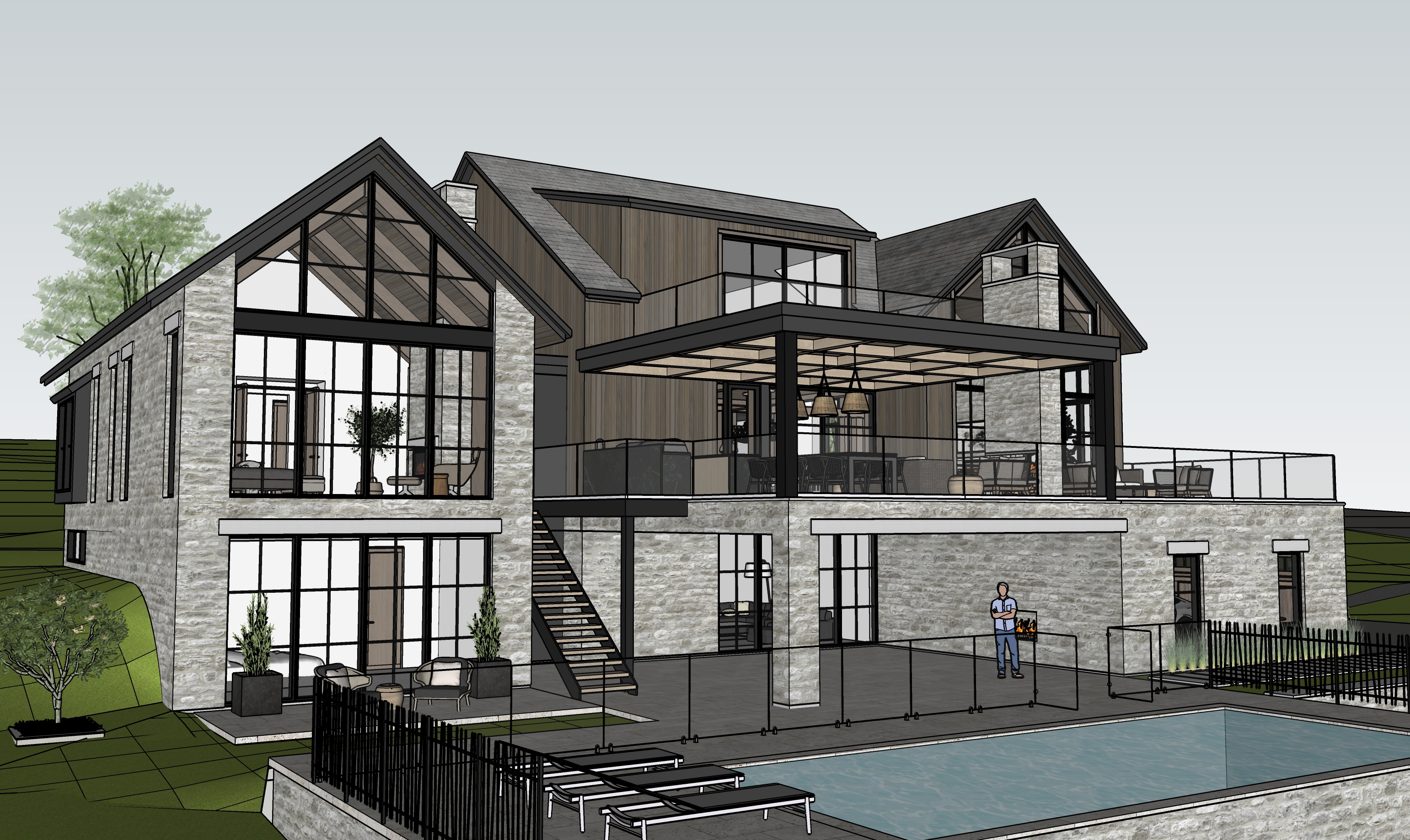 luxurious and refined home with mature trees in the foreground and exterior living furniture under the terrace