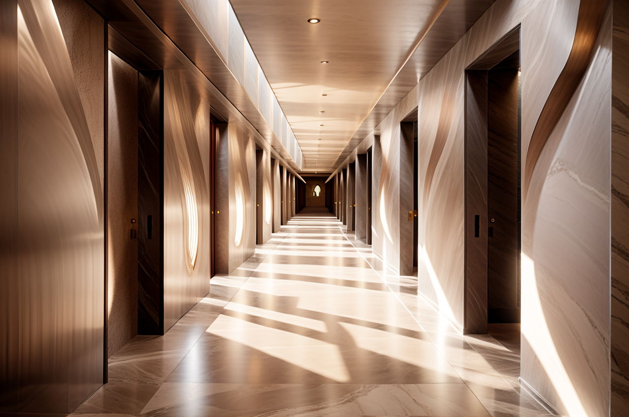 make contemporary elegance style hotel hallway realistic no lights shadows