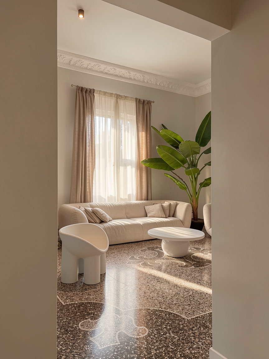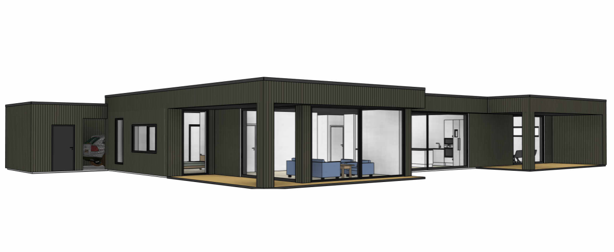render a modern minimalist flat roofed house with an elegant design the exterior should feature a sleek olive green color for the walls complemented by large glass windows reflecting a sunset the atmosphere should be serene and inviting wooden deck areas in warm light brown add contrast and harmony interior glimpses reveal cozy modern furnishings in muted blues and neutrals exuding comfort the overall mood is calm and picturesque
