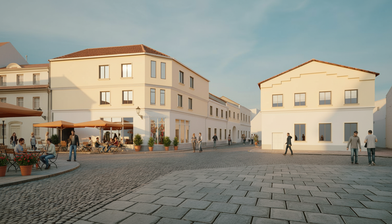 realistische stadtansicht einer historischen altstadt der lutherstadt wittenberg aus leicht erh htem blickwinkel vordergrund belebte stra e mit menschen die spazieren gehen und in caf s sitzen gespr che f hren stra enszene authentisch und lebendig keine bertriebenen menschenmassen leicht dezentes italienisches flair in der atmosph re z b warme farben entspannte stimmung stra encaf s einladend keine nderungen keine k nstlerischen anpassungen keine perspektivverschiebung keine farbkorrekturen bild bleibt 100 unver ndert niedrige bis mittelhohe geb ude mit roter dacheindeckung deutsche dachformen historische materialien wie putzfassaden holzfensterrahmen zur ckhaltende moderne akzente dezent stra enszene menschen keine markst nde tageszeit goldene stunde weiches sonnenlicht stimmiger schattenwurf fokus auf historische genauigkeit st dtische integration nat rliche perspektive linke h lfte abstrakt und leicht transluzent rechte h lfte absolut fix keine nderungen am originalbild