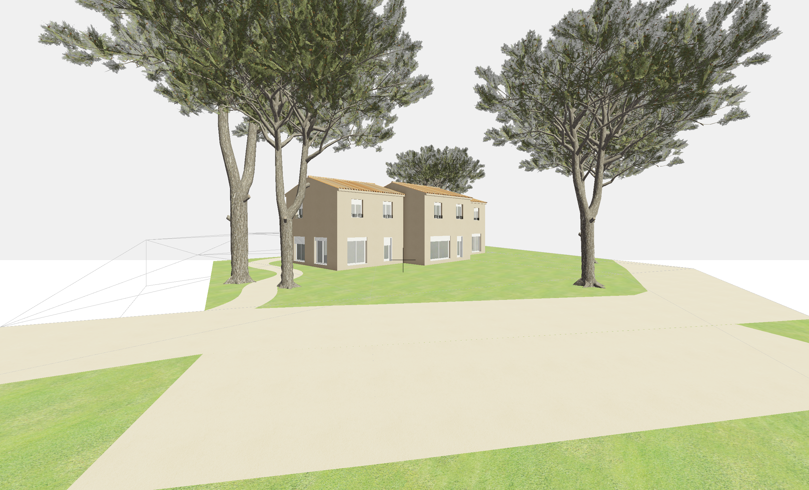 reflects in the windows and lot of sun light mediterranean pine trees in the background