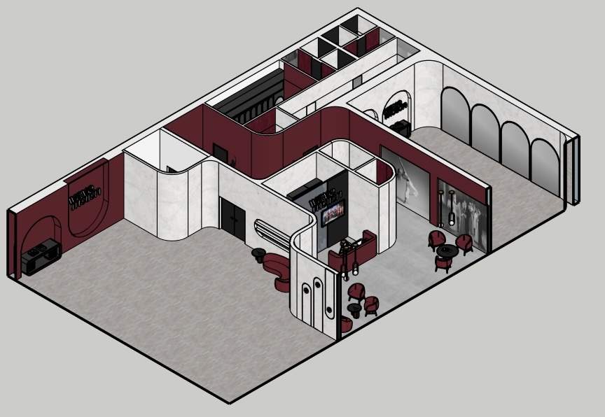 render a modern stylish interior with a sleek minimalist style use deep burgundy as the dominant color for walls and furniture paired with complementary light gray tones for contrast incorporate dark gray accents for structural elements add elegant pendant lighting with soft glow the atmosphere should be sophisticated and inviting with warm ambient lighting to enhance the rich colors include modern furniture with burgundy upholstery and subtle black details overall convey a sense of luxury and contemporary elegance