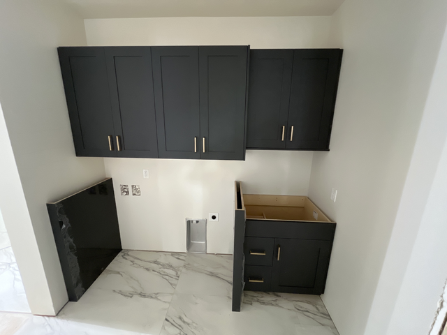 do not change the cabinets in any way preserve the exact cabinet colors materials finishes dimensions door and drawer styles hardware spacing alignment and all geometry exactly as shown do not alter the countertop shape backsplash appliances flooring lighting fixtures or wall structure only remove the construction materials clutter and mess from the scene clean the room and make it look finished and staged add a few simple tasteful home accessories appropriate for the style of the space but do not add or remove any furniture windows or architectural elements maintain the original lighting direction and realism enhance clarity and polish the photo while keeping the cabinetry and room design completely unchanged do not alter the lighting to keep the cabinet colors as they are in the image add countertops put a front load washer and dryer in the opening with a countertop on top put a sink in the base cabinet on the right stage for a laundry room