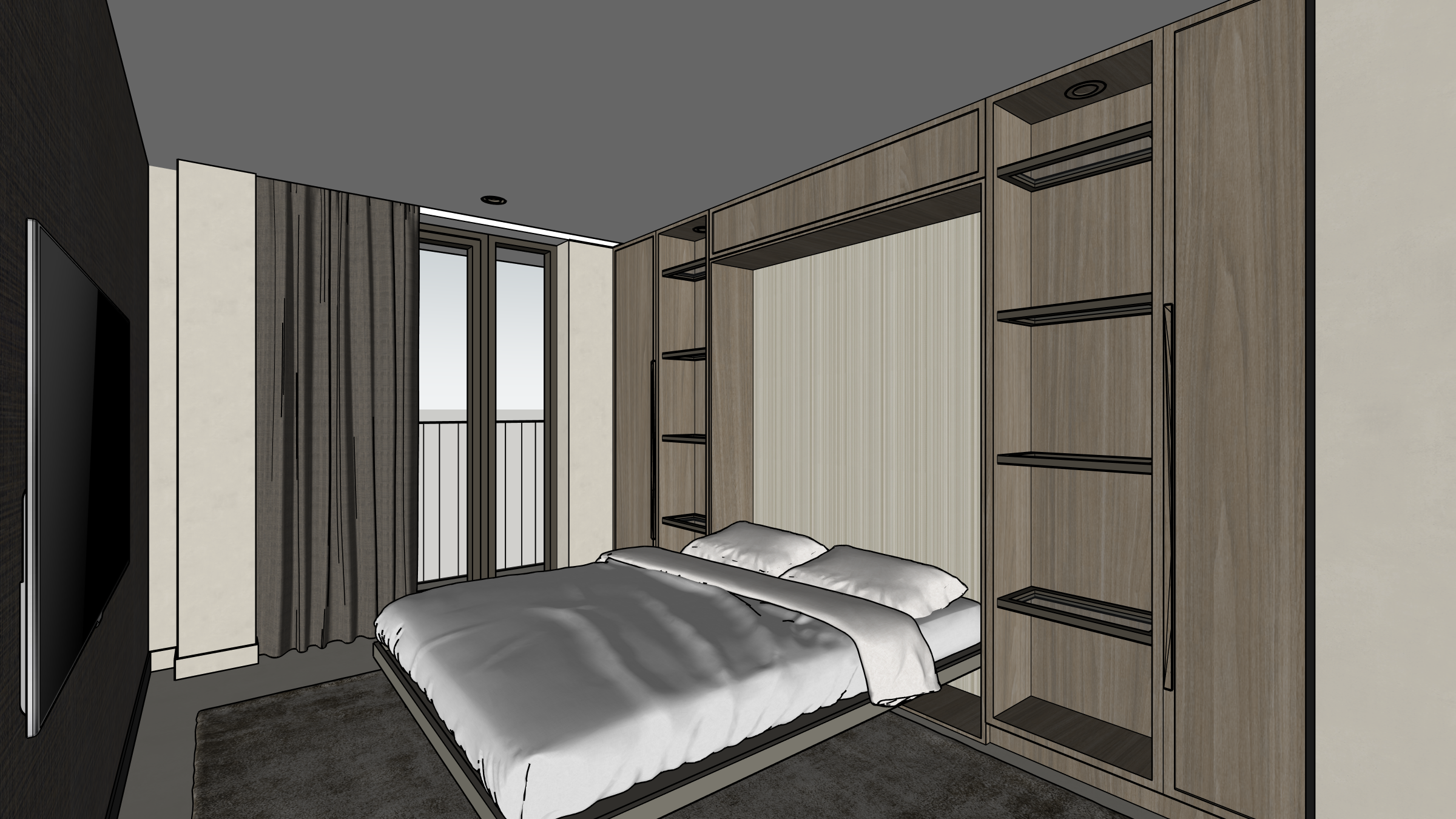 make a photorealistic image with some natural lighting decoration in the cabinet books and vases or something and a soft textile on bed do not change anything in materials or add extra spots in the ceiling only use the existing materials and interior items spots in cabinet and ceiling in color gunmetal keep the wood of the cabinet light grey oaked do not change the wallpapers and keep the ceiling light