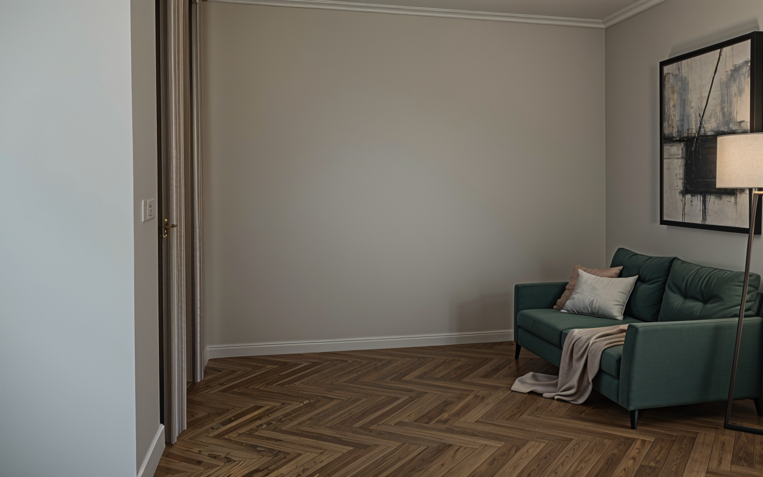 create a modern living room with a cozy and elegant atmosphere the walls are painted in a soft muted gray large windows allow natural light to pour in casting a serene glow include a sleek black wood burning stove with a warm inviting fire the floors are light wood adding warmth to the space place a comfortable light gray sofa with dark gray cushions accompanied by a plush gray rug add a black glossy coffee table with decorative items decorate with green plants for a touch of freshness the artwork is abstract with monochrome tones the overall mood is calm sophisticated and inviting architecture