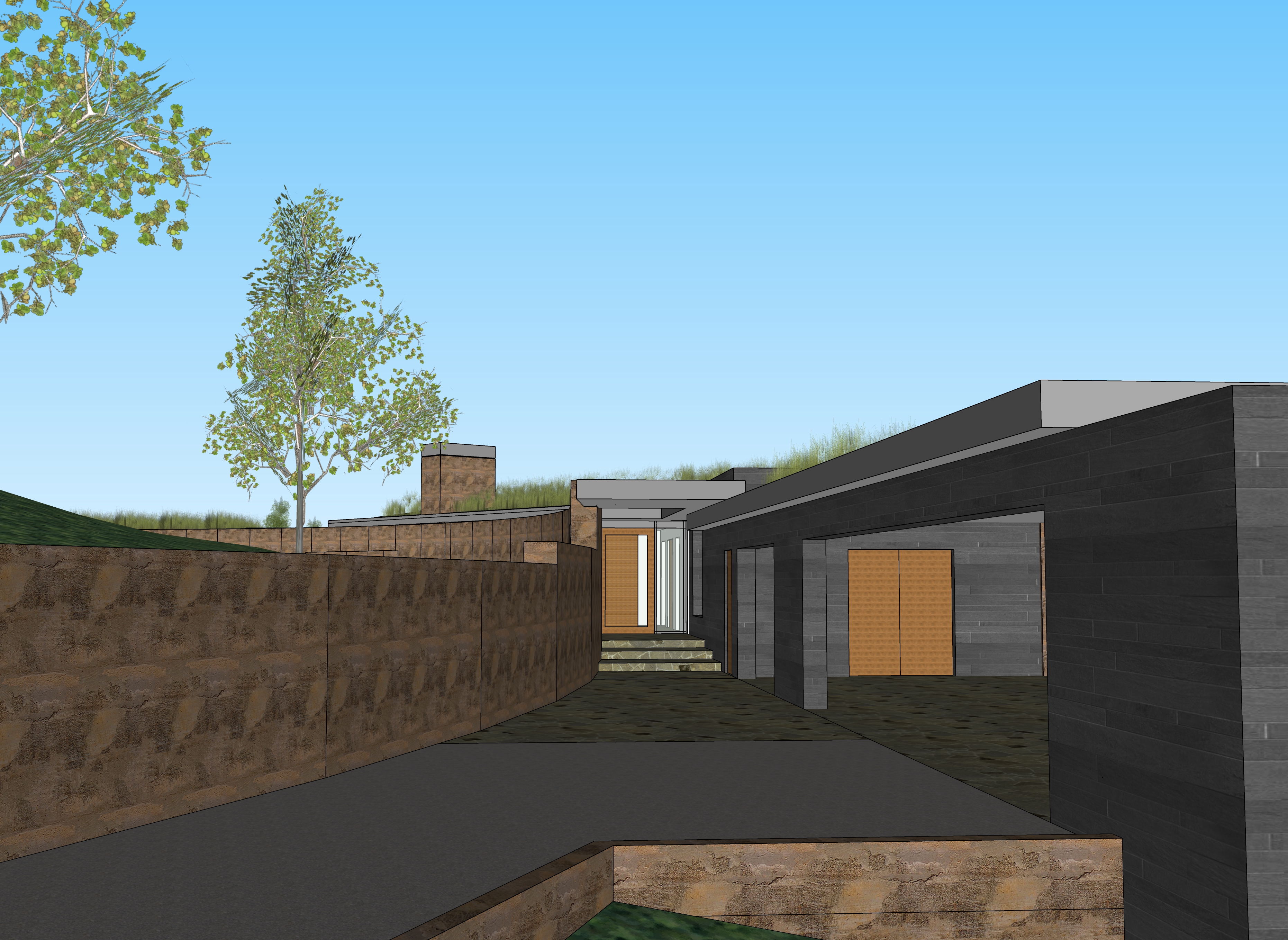 evening view add a few maple and birch trees with autumn colored leaves on the left side of the view add wild prairie grass to the landscape the house material is site cast concrete with a natural warm clay color add a land rover in the carport add a woman walking towards the front door
