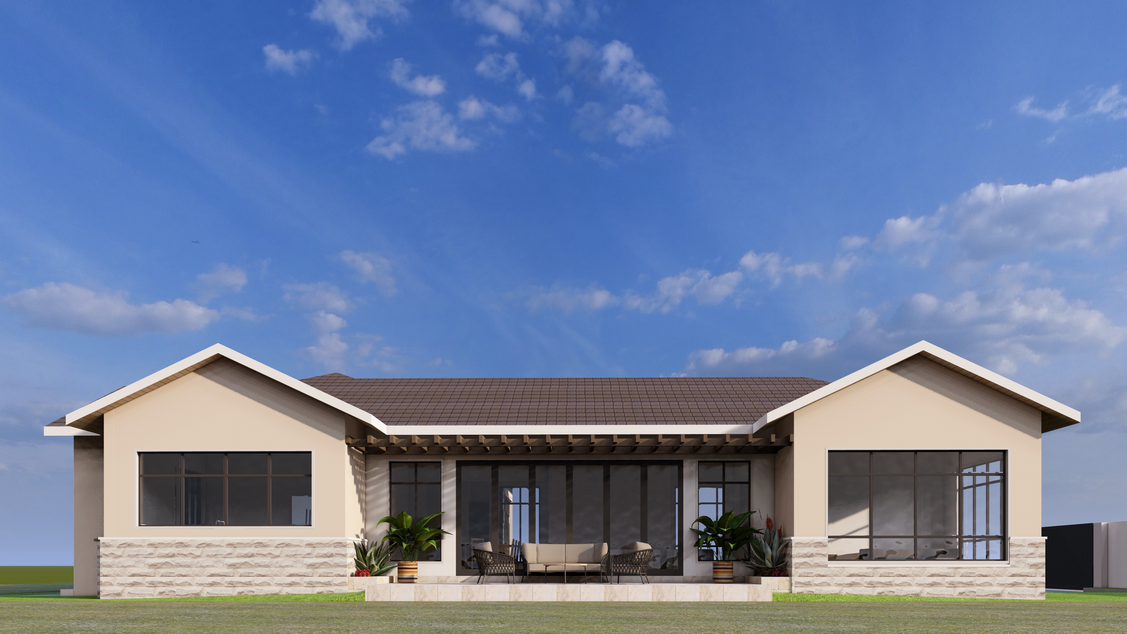this is a model of a house add few trees in background for context add vegetation with some floral ones