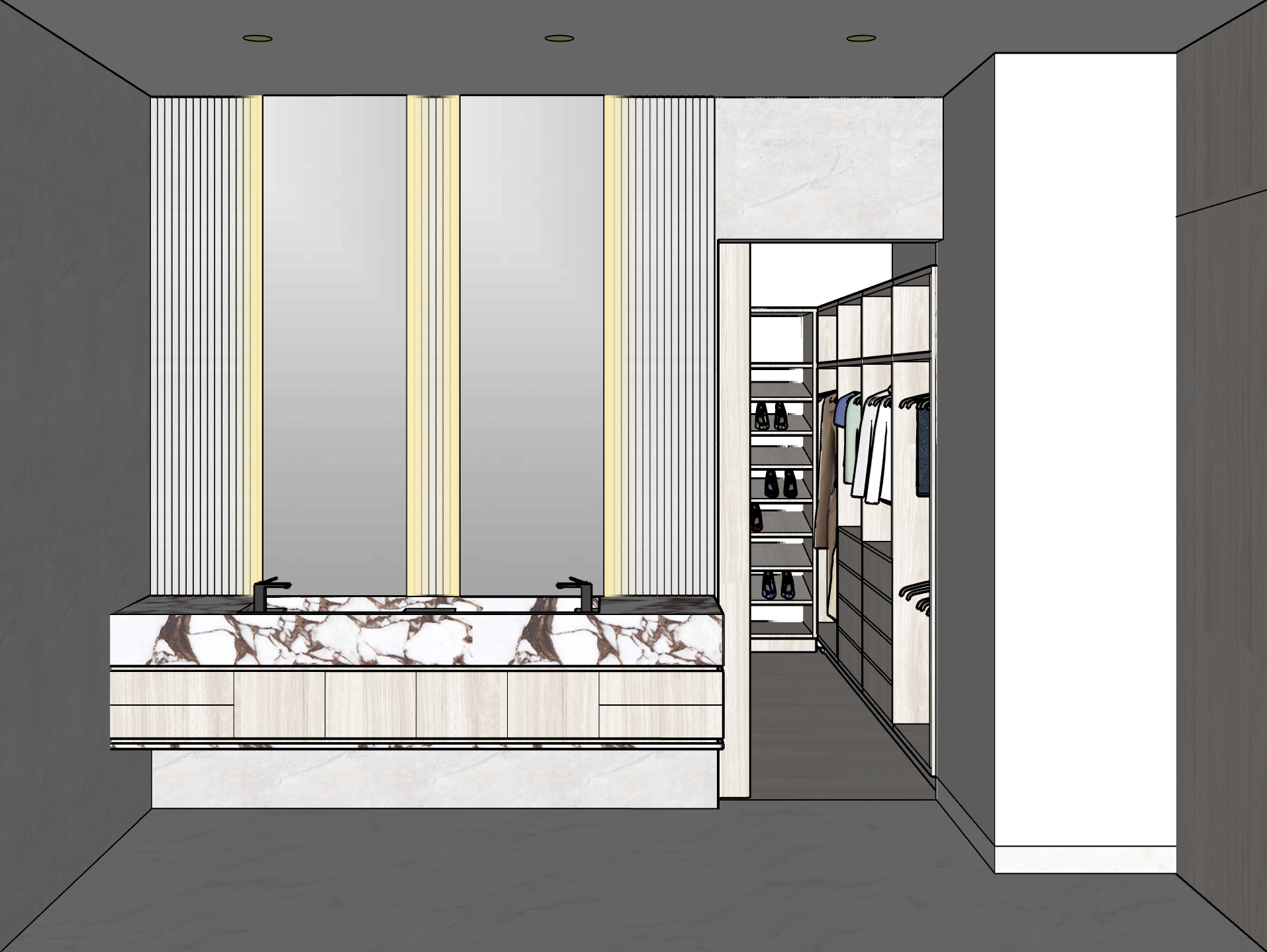 render a luxurious bathroom vanity area with a floating double sink countertop made of white marble with dark red veins below light wood drawers and a marble base add warmth and contrast behind the sinks two tall mirrors are framed by vertical led strips and fluted wall details in white marble the rest of the walls are white on the right wall there is part of the closet visible a corner of wall and then a light wood door the ceiling is white with recessed spotlights and the floor is light gray marble natural balanced lighting should highlight the marble reflections and subtle shadows creating a modern elegant and calm atmosphere consistent with a high end residential suite