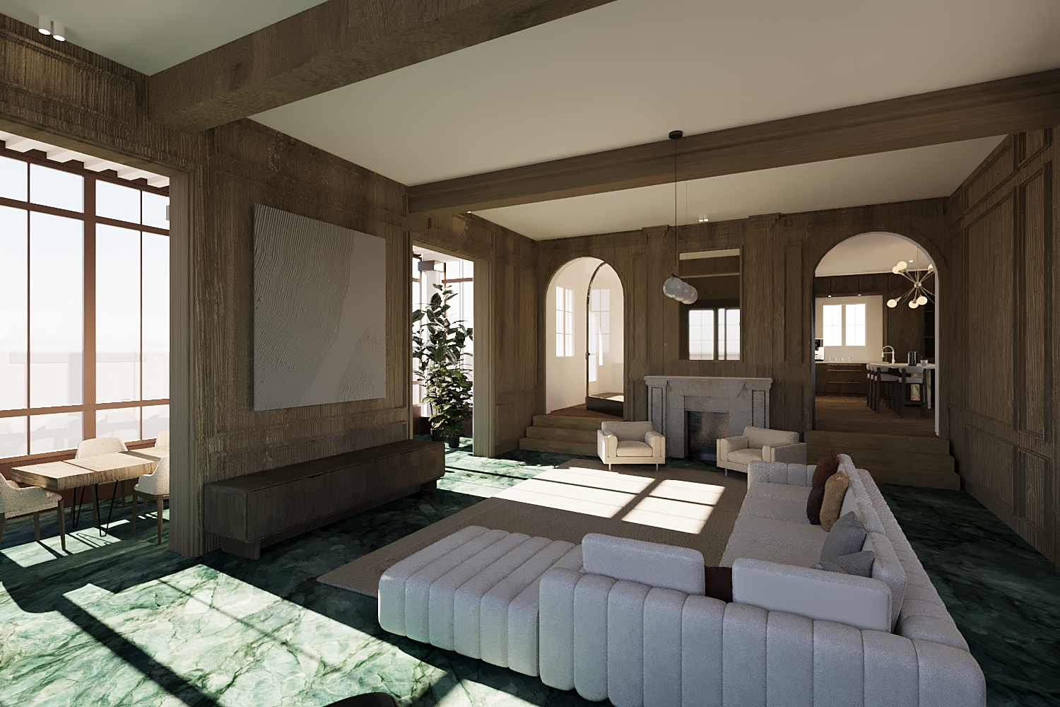 the couch more beige and nice dark wood on the surrounding walls plates on the table on the left a fire in the chimney with the arched mirror on top