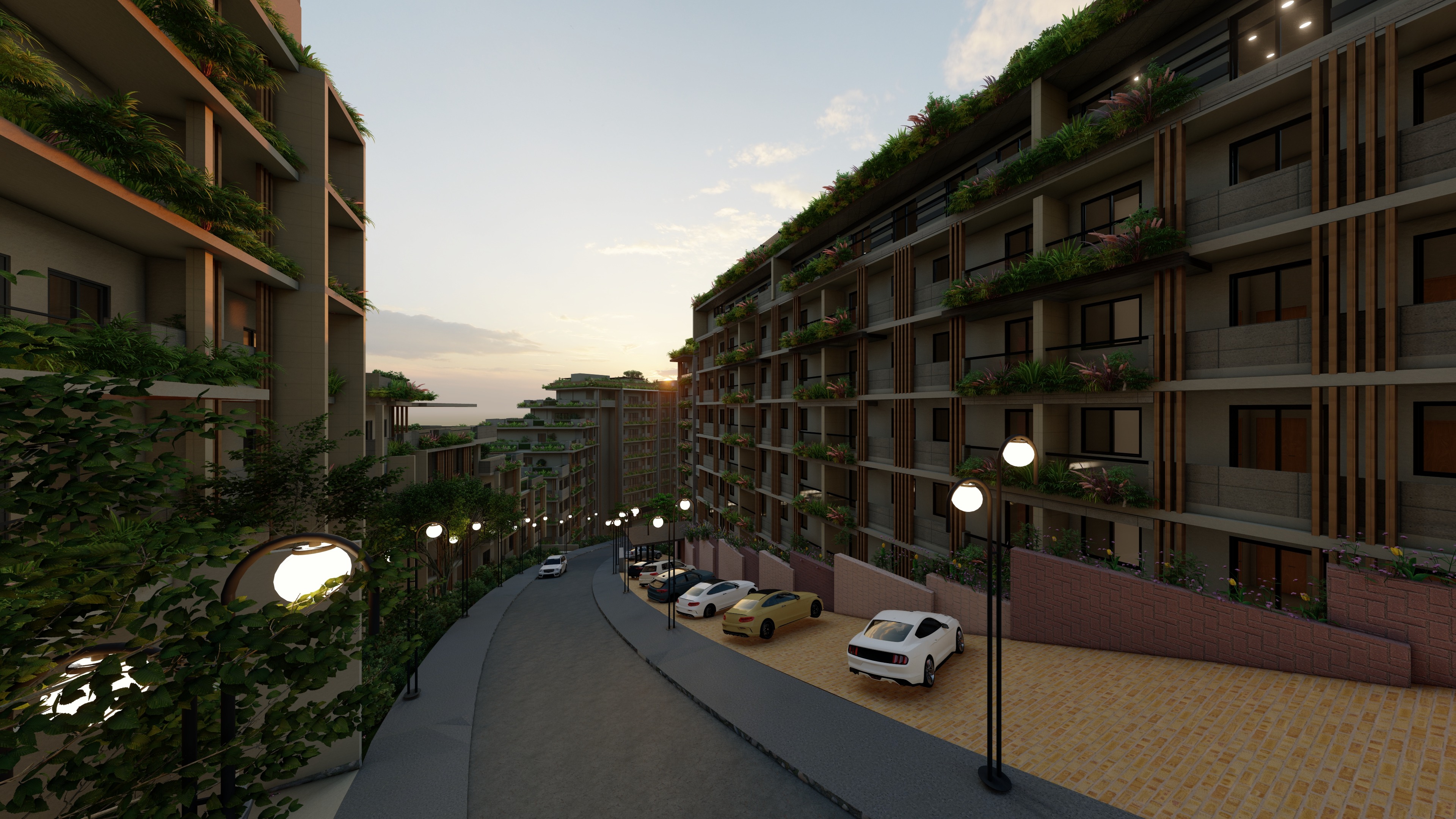 modernist exterior shot asphalt road and concrete sidewalk sunset lighting modern contemporary materials in warm gray tones wood slats in the facade cinematic photorealistic 4k resolution 16mm camera lens san mateo rizal valley in the far background add planters hanging plants in every balcony looks like a real estate photograph not a 3d render looks like a real estate photograph not a 3d render do not change the signage at the front asphalt road and concrete sidewalk sunset lighting modern contemporary materials in warm gray tones wood slats in the facade cinematic photorealistic 4k resolution 16mm camera lens san mateo rizal valley in the far background add planters hanging plants in every balcony looks like a real estate photograph not a 3d render architecture cinematic photorealistic 4k resolution 16mm camera lens metro manila city skyline in the far background