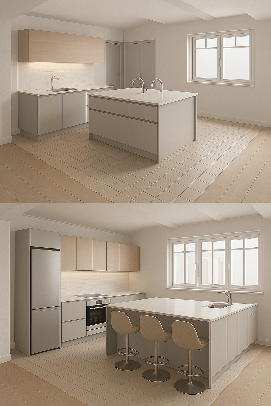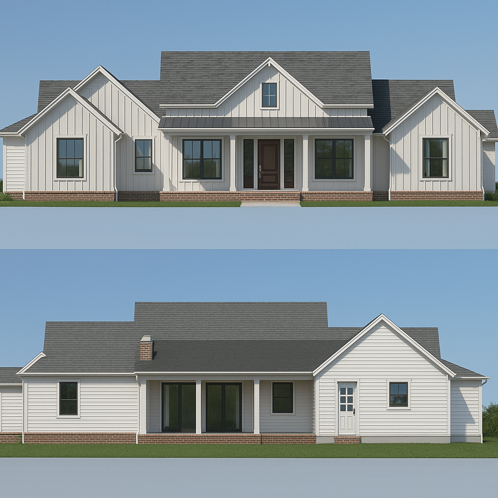 make as photorealistic as possible while keeping textures the same as selection professional landscaping in a lightly wooded scene with good lighting white siding black shingle roof black windows to match plan black front door no fireplace stone only under the columns