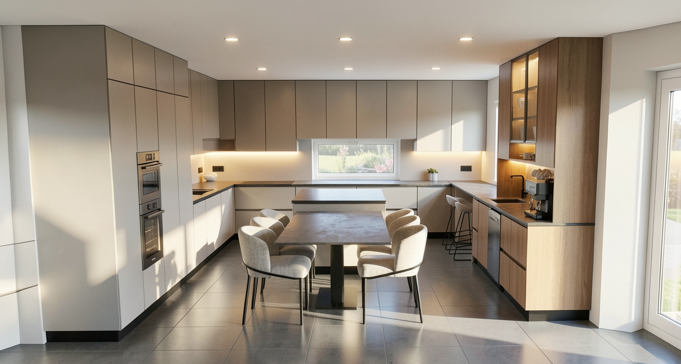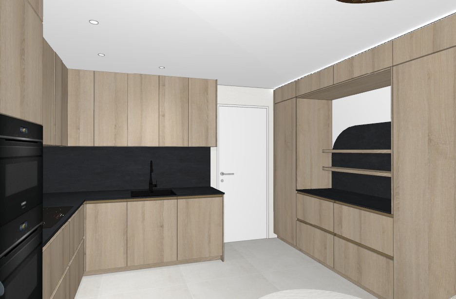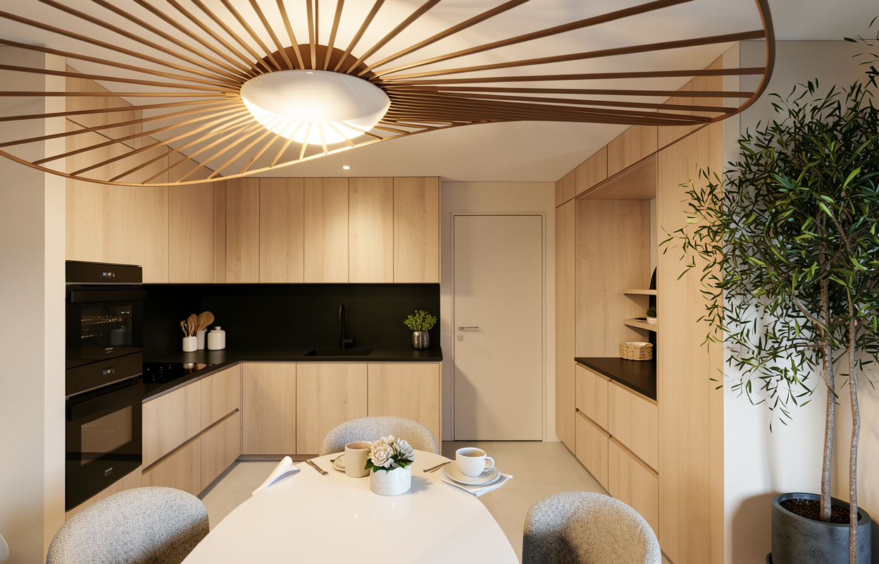 render a modern kitchen with a minimalist design featuring light wood cabinetry in a soft oak color and a sleek black countertop a striking light fixture hangs from the ceiling composed of dark brown fan like elements the room is filled with natural light creating a warm and inviting atmosphere add comfortable dining chairs in a textured oatmeal fabric around a light cream table enhancing the cozy yet elegant vibe include a subtle indoor olive tree in the corner adding a touch of greenery for freshness against the neutral palette the walls are a smooth soft white complementing the clean and contemporary aesthetic add decor