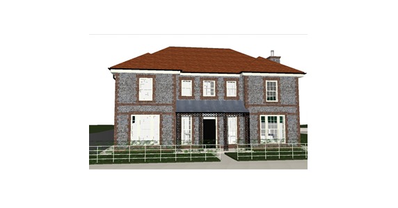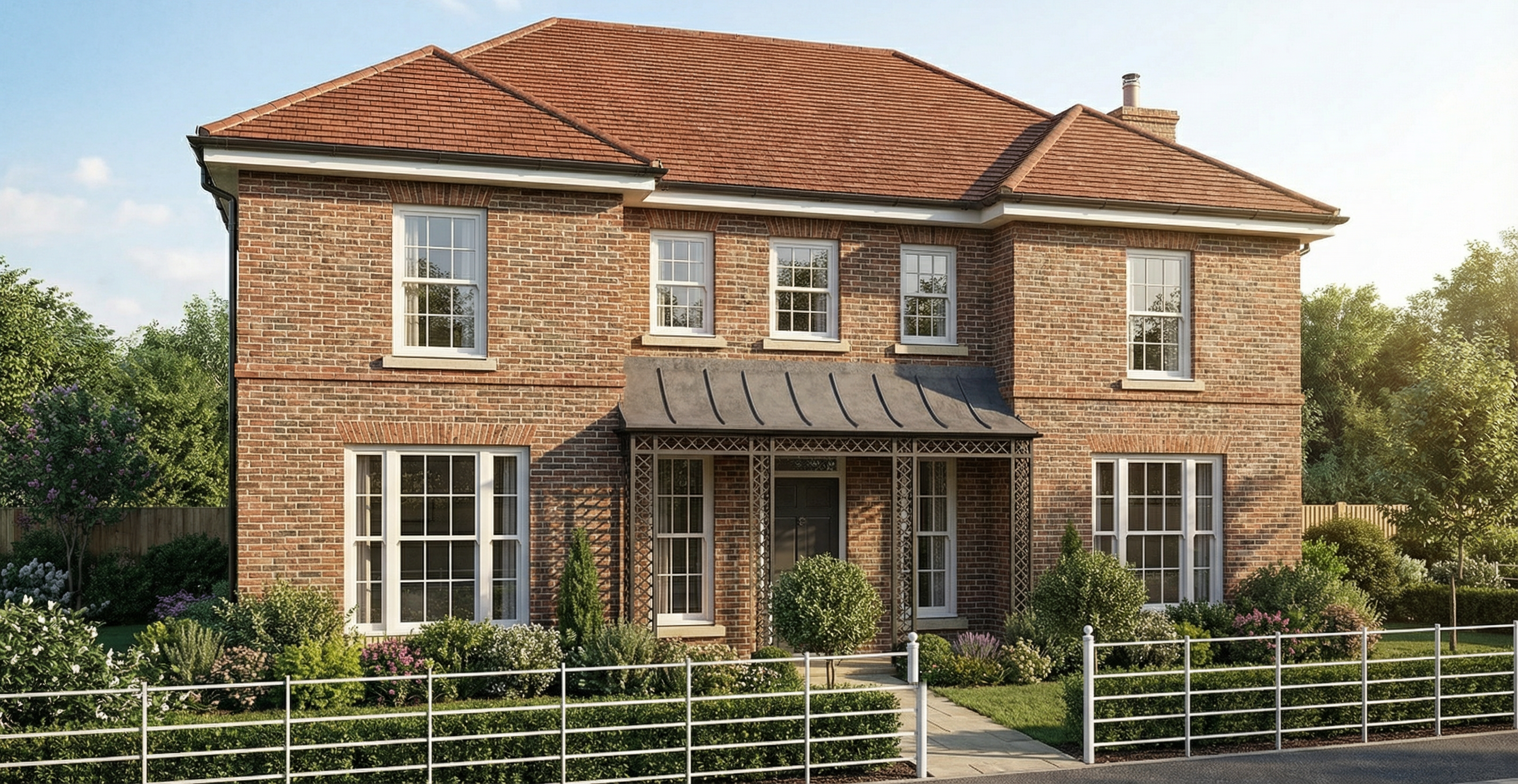 make everything look more realistic like a photograph with elegant planting and dont change angle of view or design of house keep brick and flint finishes and make the wrought iron fence at the front in black