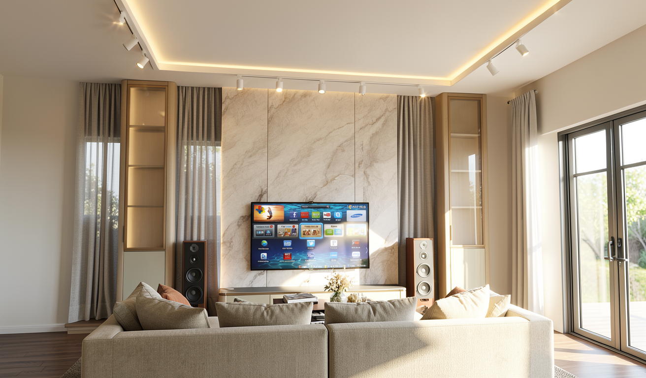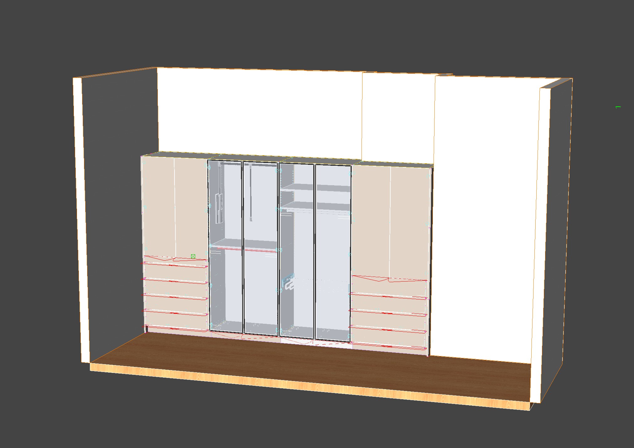 add some clothes in this wardrobe nicely the central doors are in lightly smoked glass with a blacb alimunium frame around the other doors and drawers are in the fenix 0748 beige arizona panels made