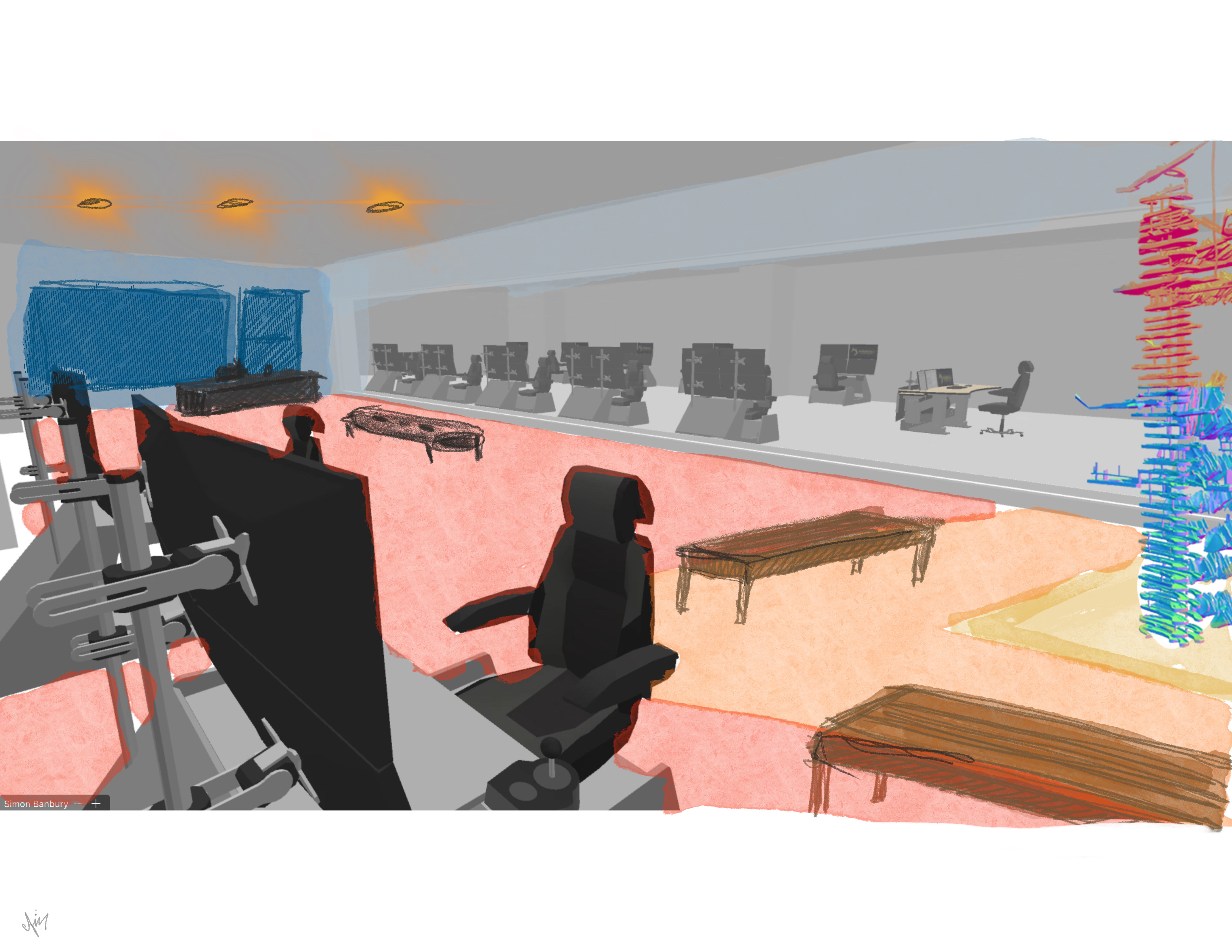 interior shot an indoors shot of a visitor s center the front wall is a large glass wall showing a large and deep room where operators are at work at futuristic computer stations emitting light behind the window the left side shows simulation stations while the wooden benches are everywhere to allow visitors to sit the back wall has a large video screen